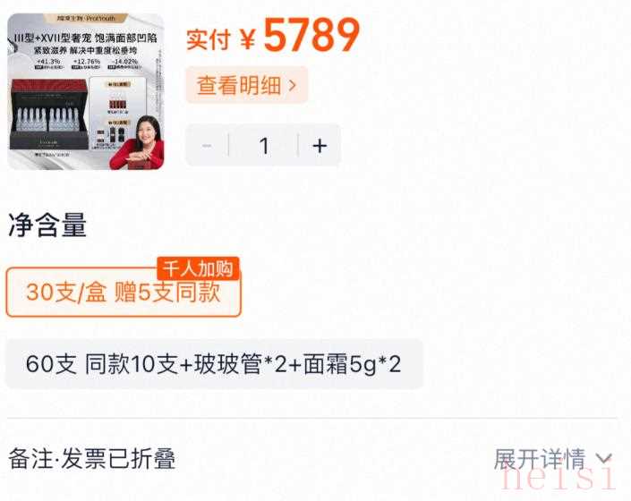 記者在ProtYouth天貓旗艦店看到,單一成分代表產(chǎn)品——奢寵雙膠原蛋白(30支裝)售價高達(dá)5789元,折算下來單支為193元。