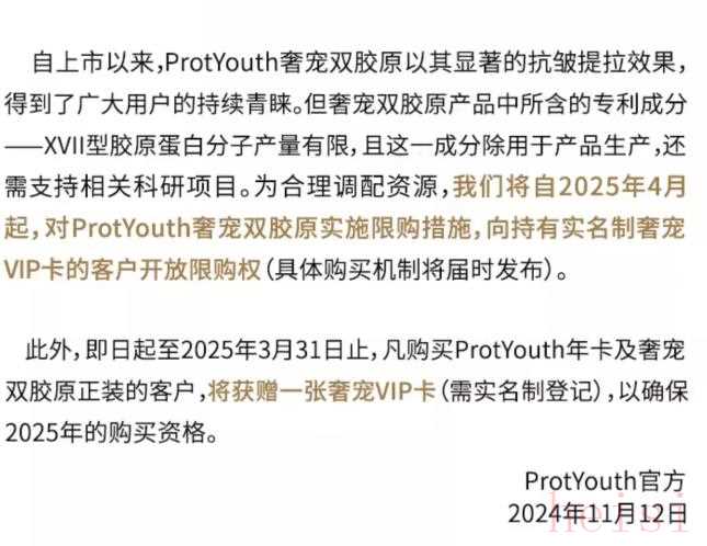 在該產(chǎn)品的詳情頁,記者看到了落款日期為2024年11月12日的限購聲明:“XVII型膠原蛋白分子產(chǎn)量有限,將于2025年4月實(shí)施限購,僅對持有實(shí)名制奢寵卡的客戶開放?!?/p>