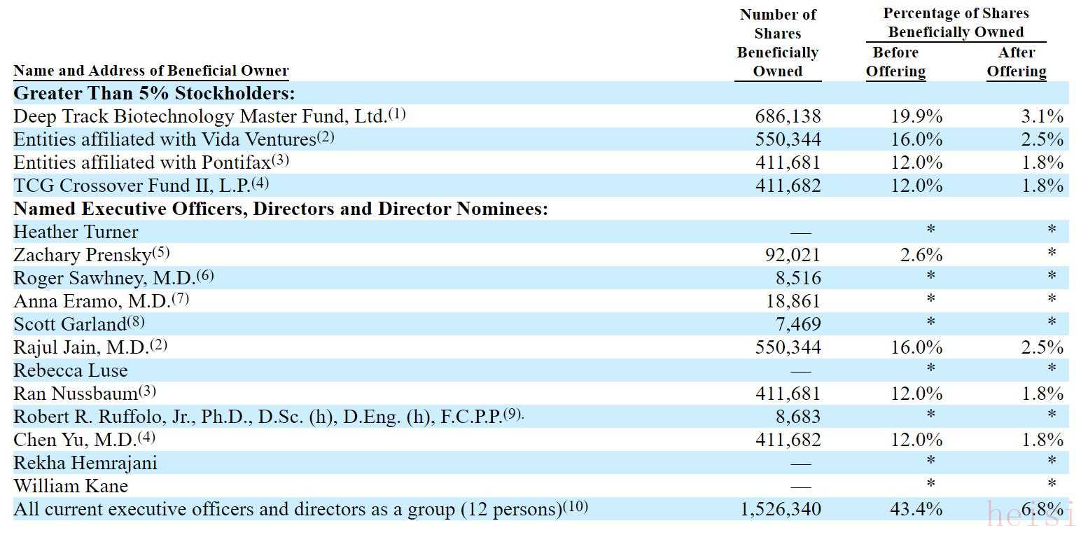 IPO前,Deep Track Biotechnology Master Fund持股為19.9%,Vida Ventures持股為16%,Pontifax、TCG Crossover Fund II分別持股為12%,Zachary Prensky持股為2.6%。