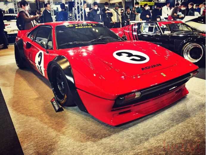 LB展臺(tái)是每年車展都不能錯(cuò)過(guò)的地方。今年的陣容依舊很強(qiáng)大,眼前這臺(tái)法拉利308GTB就是LB品牌的經(jīng)典之作,火紅色的外觀配上啞光黑色的鉚釘寬體,看上去格外有型。