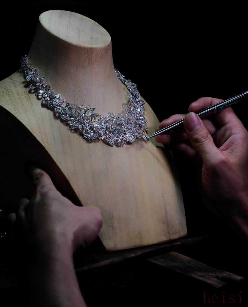 “鉆石之泉”取材于象征歡愉自由的噴泉,創(chuàng)作靈感源自豐吉在巴黎生活時對遍布全城,經(jīng)由古典優(yōu)雅的法國“美好時代”遺留下來之數(shù)百座噴泉雕塑的著迷。跳躍的拱形曲線在白鉆底下構(gòu)成優(yōu)雅的圈圈,并在尾端達至高潮??偣?95顆高級白鉆珠粒構(gòu)成了噴泉的水柱,位于中央的 22.08 克拉純凈白鉆主石彷似不停地噴灑歡樂的水花,在炫目的陽光下折射出璀璨奪目的光芒。為了重現(xiàn)靈動的泉涌,豐吉的極致創(chuàng)意對鑲嵌和制作工藝提出了新的挑戰(zhàn),每一顆鉆石珠粒的尺寸、形狀和凈度都必須符合嚴格的要求,增加了搜集難度。豐吉和她的珠寶工匠們耗時數(shù)百工時,將“鉆石之泉”打造成一件宛如當代雕塑作品般的收藏級藝術(shù)珠寶。