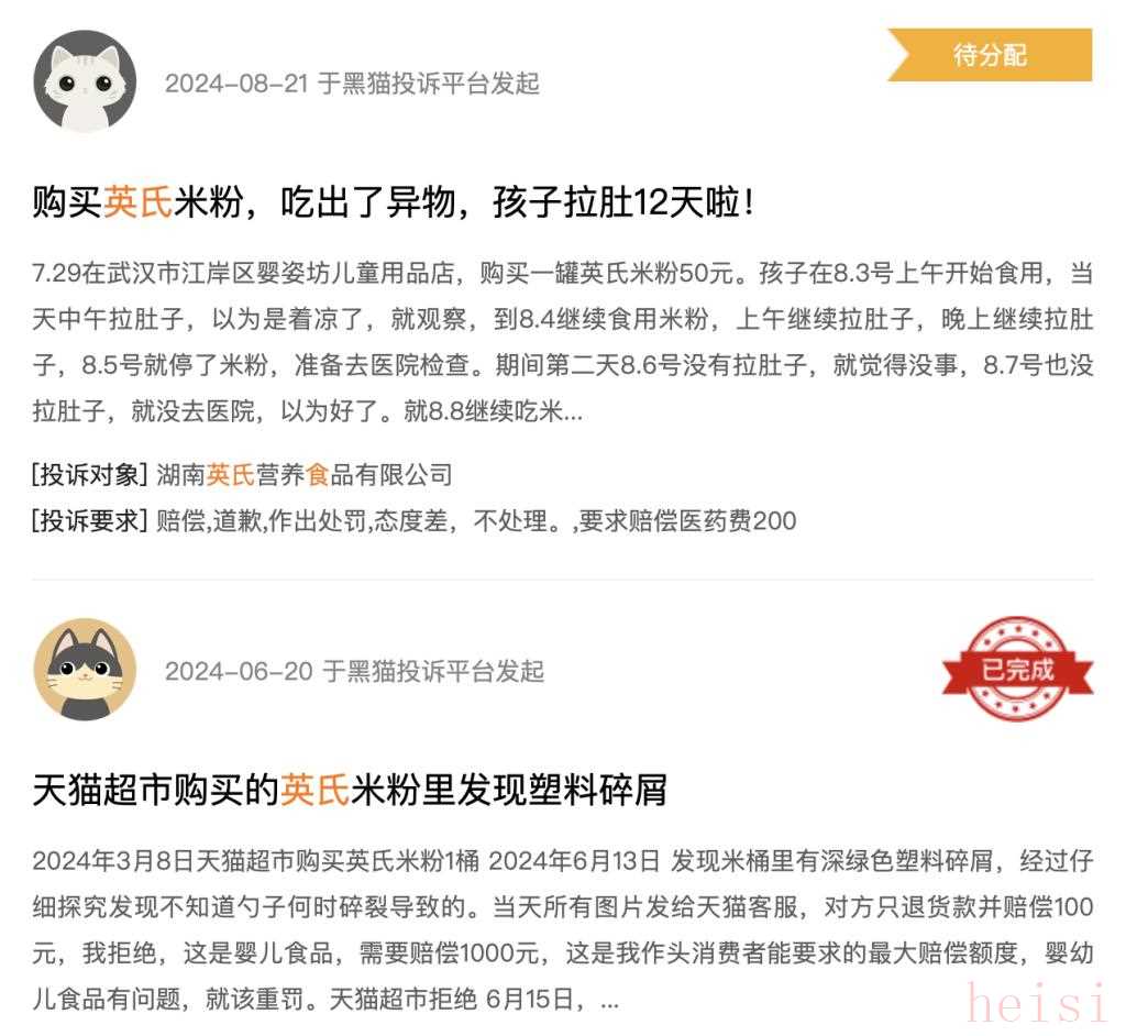 消費(fèi)端的質(zhì)量反饋同樣不容忽視。在黑貓投訴平臺上,有多條涉及英氏產(chǎn)品的投訴,問題集中在米粉異物、磨牙棒霉變、包裝破損等方面。而此次北交所向英氏控股發(fā)出的問詢函中,也有對其代工模式的問詢。