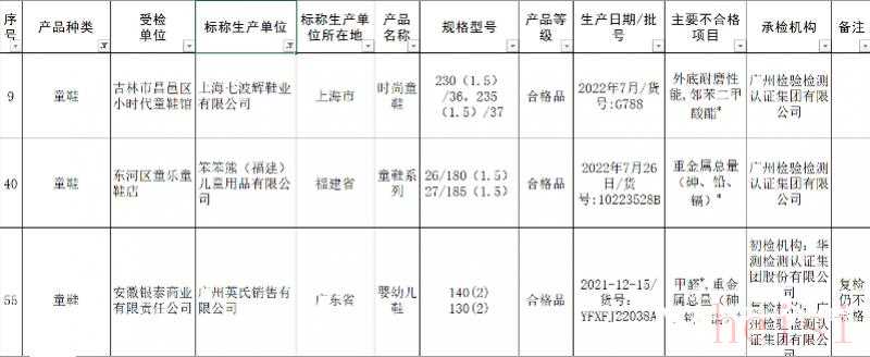 其中,標(biāo)稱上海七波輝鞋業(yè)有限公司生產(chǎn)的時尚童鞋“外底耐磨性能”和“鄰苯二甲酸酯”項(xiàng)目不合格;標(biāo)稱笨笨熊(福建)兒童用品有限公司生產(chǎn)的童鞋系列,以及標(biāo)稱永高人兒童用品有限公司生產(chǎn)的布鞋均被檢出“重金屬總量(砷、鉛、鎘)”項(xiàng)目不合格;標(biāo)稱廣州英氏銷售有限公司生產(chǎn)的嬰幼兒鞋“甲醛”和“重金屬總量(砷、鉛、鎘)”項(xiàng)目不合格,復(fù)檢后仍不合格。