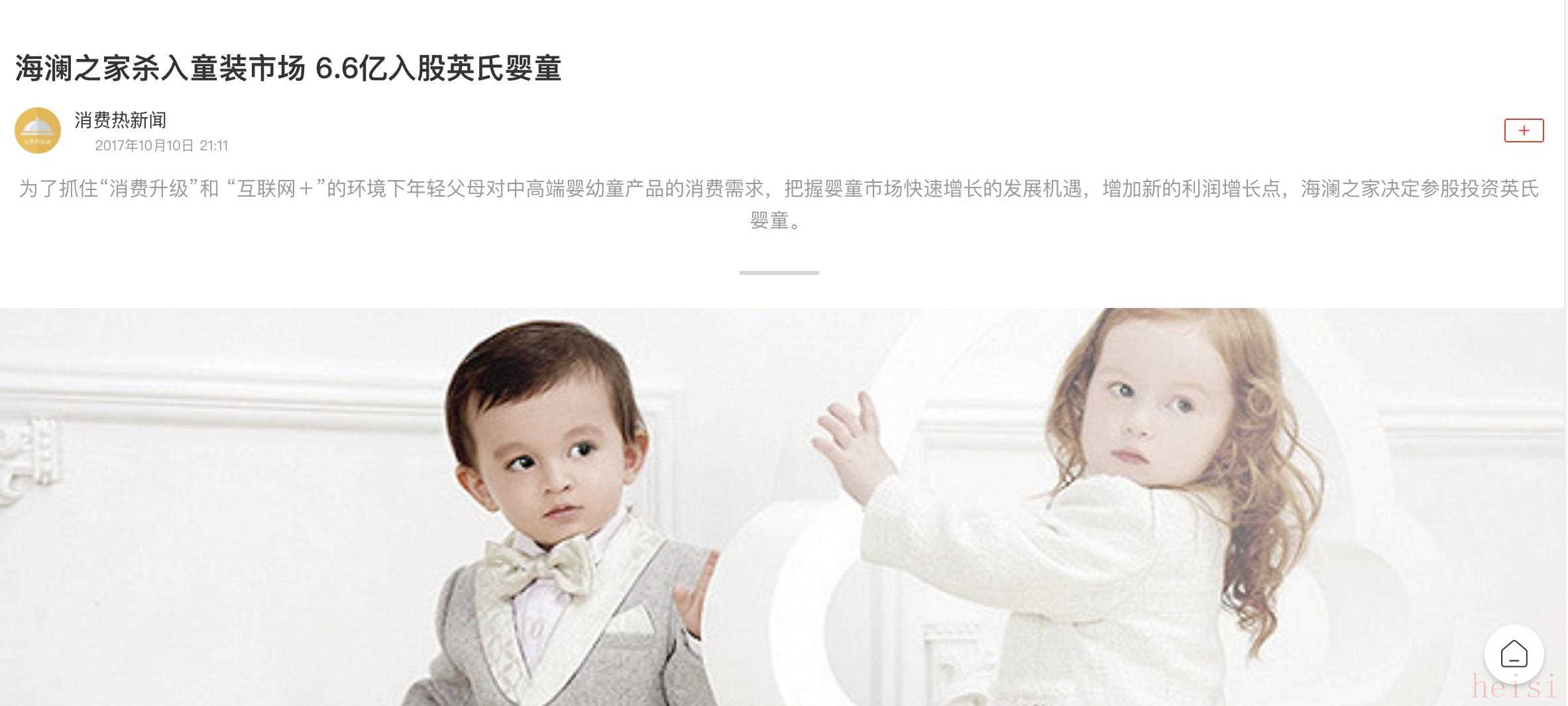 公開資料顯示,2017年,海瀾之家殺入童裝市場,以6.6億入股英氏嬰童。企業(yè)當(dāng)時發(fā)布的公告稱,公司全資子公司江陰海瀾之家投資有限公司以自有資金人民幣6.6億元受讓新余云開投資合伙企業(yè)(有限合伙)及新余行云投資管理有限公司持有的英氏嬰童用品有限公司44.0039%的股權(quán),成為其第二大股東。