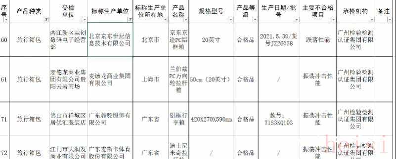 其中,標(biāo)稱麥德龍商業(yè)集團(tuán)有限公司生產(chǎn)的蘭伯茲PC萬向輪拉桿箱、標(biāo)稱廣東駱駝服飾有限公司生產(chǎn)的鋁框行李箱、標(biāo)稱廣東麥斯卡體育股份有限公司生產(chǎn)的迪士尼米奇拉桿箱,均被檢出振蕩沖擊性能項(xiàng)目不合格。此外,1批次標(biāo)稱北京京東世紀(jì)信息技術(shù)有限公司生產(chǎn)的京東京造PC鋁框箱被抽檢出跌落性能不合格。
