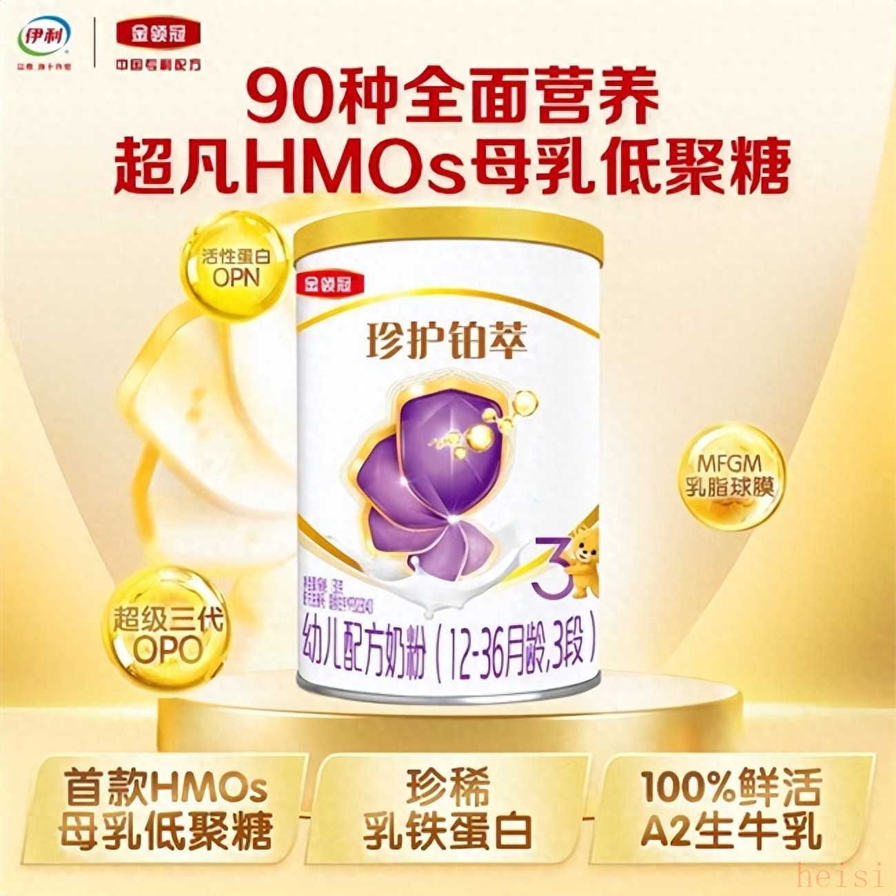 品牌解析:源自內(nèi)蒙古呼倫貝爾伊利專屬A2有機(jī)牧場,地處北緯49°世界黃金奶源帶。牧場連續(xù)3年禁用化肥、農(nóng)藥與抗生素,臻選30%A2型奶牛,以有機(jī)牧草為食,需通過“牛種DNA檢測+原奶雙重驗(yàn)證”方可入選。核心配方:①頂配保護(hù):6種有機(jī)HMOs,促進(jìn)腸道有益菌繁殖,強(qiáng)化自身防護(hù)反應(yīng);95%高純度高活性乳鐵蛋白,每100g奶粉含100mg,抵御11類外敵入侵,減少25%呼吸系統(tǒng)不適和肚肚不適。②頂配吸收:首款有機(jī)OPO,含量為4g/100g,全球僅有0.02%有機(jī)OPO獲得中歐雙重有機(jī)認(rèn)證,關(guān)鍵營養(yǎng)吸收高達(dá)97%,便便軟化增加37%。每100g奶粉含4億雙重活性益生菌,88倍雙重自護(hù)益生元,促進(jìn)寶寶體內(nèi)有益菌增長。③頂配認(rèn)知:18種活性腦營養(yǎng)群賦能認(rèn)知力,其中80mg/100g高量DHA,配合ARA、腦磷脂群、MFGM乳脂球膜等,助力寶寶智慧成長。差異化亮點(diǎn):生產(chǎn)過程實(shí)現(xiàn)溫室氣體零排放,獲“零碳有機(jī)奶粉”認(rèn)證,無人工香精、蔗糖與棕櫚油添加,口感清淡貼合寶寶味覺發(fā)育規(guī)律。三、金領(lǐng)冠珍護(hù)菁蘊(yùn)奶粉
