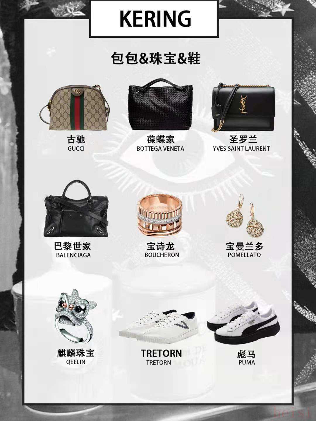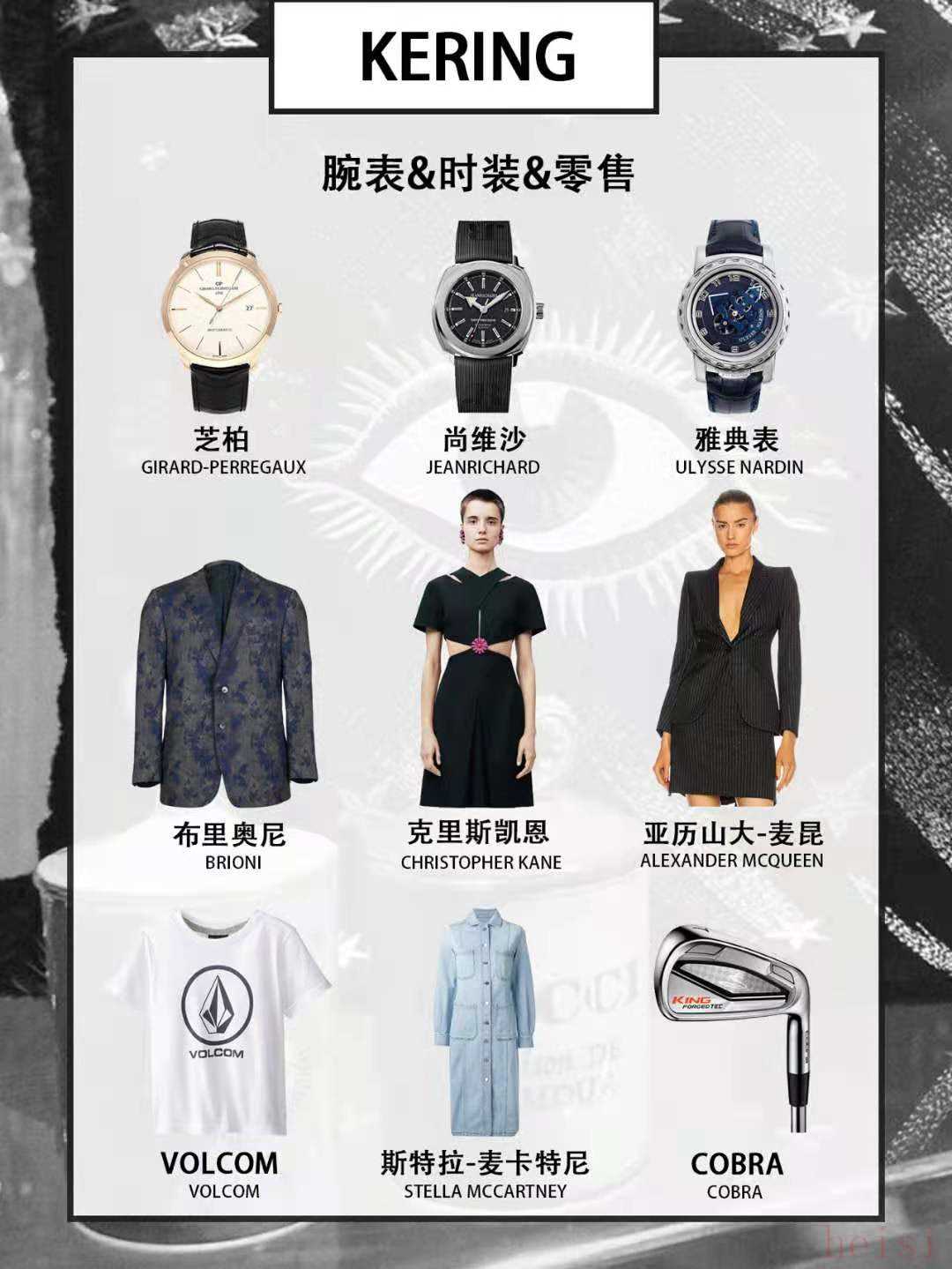 2. "開(kāi)云集團(tuán) (Kering)":這是法國(guó)的奢侈品巨頭,旗下?lián)碛斜姸喔咧绕放?,包括古馳 (Gucci)、圣羅蘭 (Saint Laurent)、愛(ài)馬仕 (Hermès)、巴寶莉 (Burberry)、凱特·辛迪 (Kate Spade)、See by Chloé 等。