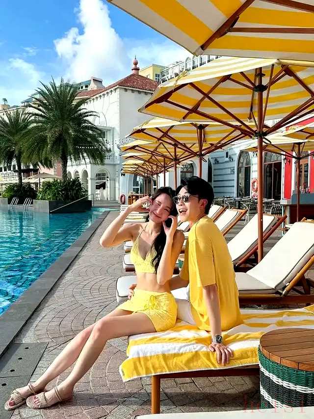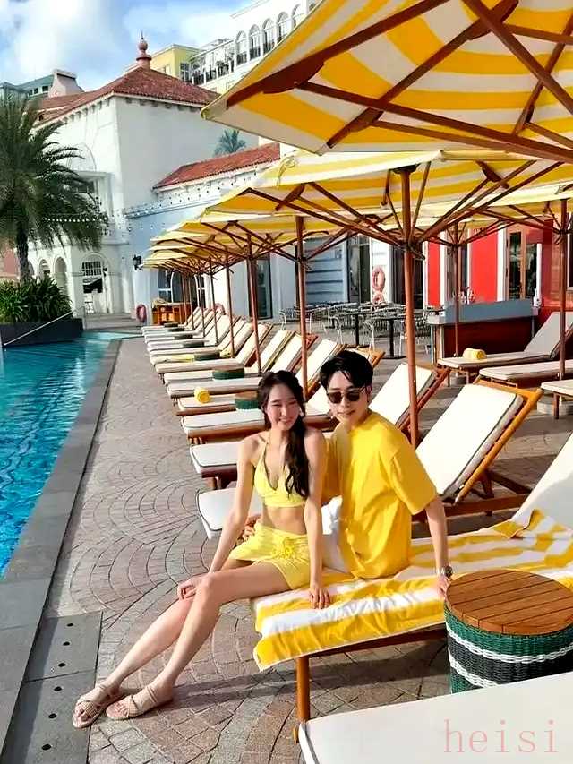 8月24日,陸浩明帶著陳詩欣飛到海島,黃泳衣配黃T恤,顏色亮到手機自動調(diào)高對比度。
