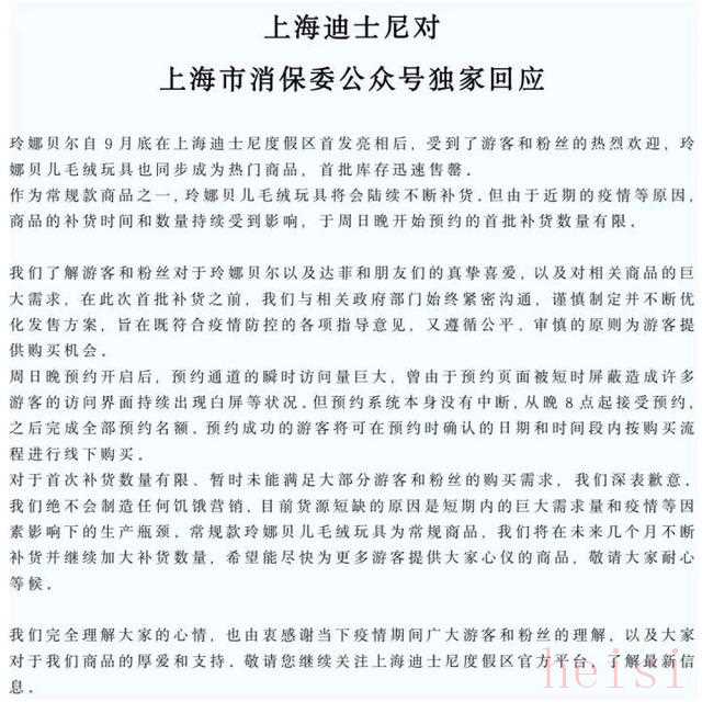 上海迪士尼在對(duì)上海市消保委的回應(yīng)中稱(chēng):對(duì)于未能滿足大部分游客和粉絲的購(gòu)買(mǎi)需求深表歉意,絕對(duì)不會(huì)制造任何饑餓營(yíng)銷(xiāo)。目前貨源短缺的原因是短期內(nèi)的巨大需求量和疫情等因素影響下的生產(chǎn)瓶頸。迪士尼將在未來(lái)幾個(gè)月不斷補(bǔ)貨并繼續(xù)加大補(bǔ)貨數(shù)量,盡快為更多游客提供大家心儀的商品。