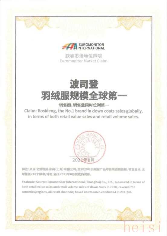 今年8月,波司登獲得了由世界知名市場調研機構歐睿國際頒發(fā)的“羽絨服規(guī)模全球第一”證明,它刷新了羽絨服行業(yè)多項標準,曾參與5項國際標準、9項國家標準、4項行業(yè)標準的起草修訂工作,制定各類企業(yè)技術標準218項;還擁有行業(yè)內全國首家國家級實驗室,獲得各類專利146項,開展科技項目23項,并獲得高新技術產品認證3項。