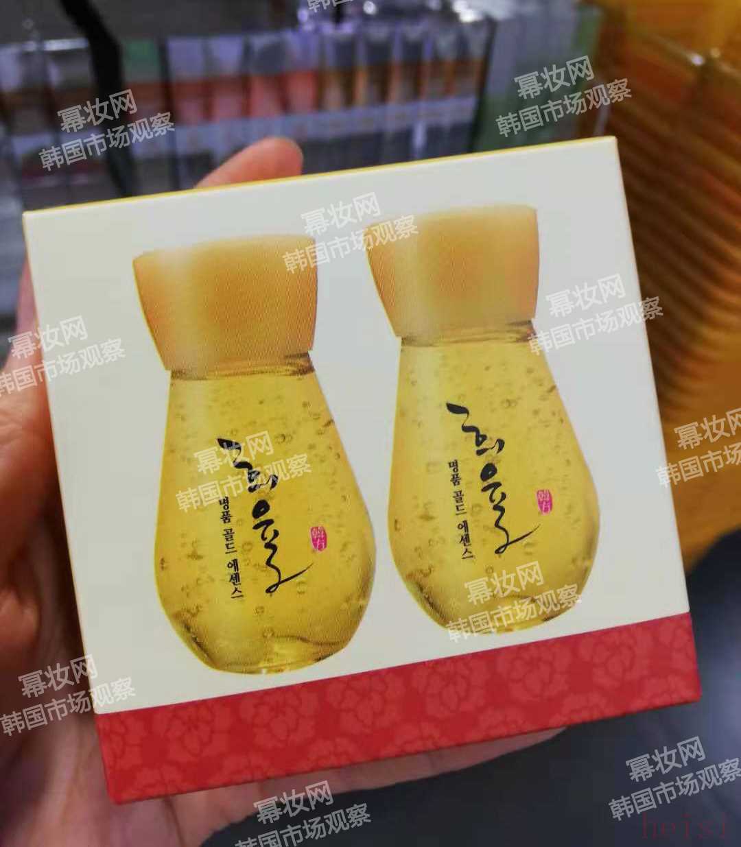 (冪妝網(wǎng) 韓國(guó)偵察兵 實(shí)地現(xiàn)場(chǎng)拍攝)兩款的主要不同在于,這款產(chǎn)品的包裝設(shè)計(jì)更加獨(dú)特,它以“黃金”作為主色調(diào),讓人一眼便聯(lián)想到“黃金”的概念,同時(shí)采用更顯質(zhì)感的玻璃滴管瓶,從外觀上強(qiáng)化這款產(chǎn)品的價(jià)值。