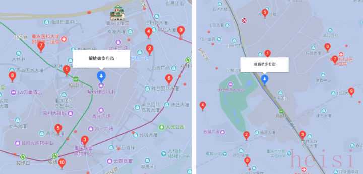 解放碑附近23個公交站,3條輕軌(地鐵)線(1/2/6號)