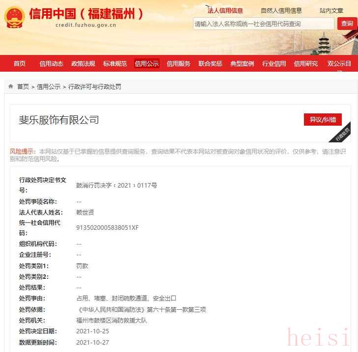 中國經(jīng)濟網(wǎng)北京10月29日訊 日前,信用中國(福建福州)網(wǎng)站公示的一則行政處罰決定書(鼓消行罰決字﹝2021﹞0117號)顯示,斐樂服飾有限公司因占用、堵塞、封閉疏散通道、安全出口,被福州市鼓樓區(qū)消防救援大隊處以罰款。行政處罰依據(jù)為《中華人民共和國消防法》第六十條第一款第三項。