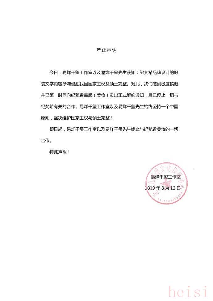 剛剛,易烊千璽工作室發(fā)表聲明稱,已第一時間向紀梵希品牌美妝發(fā)出正式解約通知,且已停止一切與紀梵希有關(guān)的合作。聲明還表示,易烊千璽工作室以及易烊千璽先生始終堅持一個中國原則,堅決維護國家主權(quán)與領(lǐng)土完整!
