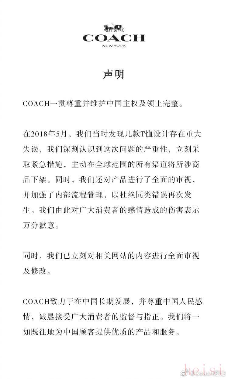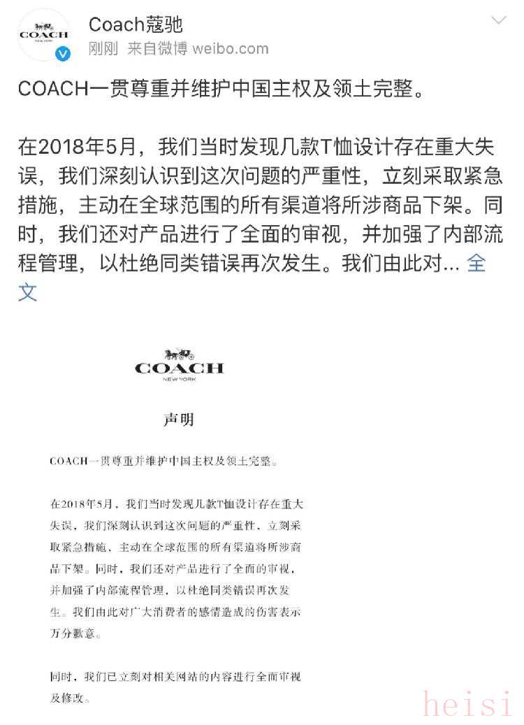 12日中午,蔻馳在其官方微博就“T恤及官網(wǎng)將香港、澳門和臺灣列為國家”一事發(fā)表道歉聲明。聲明說,“在2018年5月,發(fā)現(xiàn)幾款T恤設(shè)計存在重大失誤,深刻認識到問題的嚴重性,立刻采取緊急措施,主動在全球范圍的所有渠道將所涉商品下架”。
