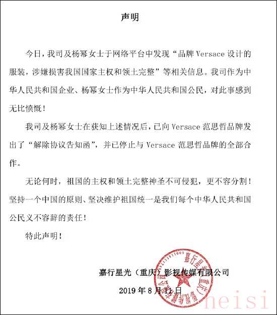 此前,8月11日,楊冪工作室亦發(fā)布聲明,稱“無論何時,中國的領(lǐng)土完整和主權(quán)都神圣不可侵犯,更不容分割! ”表示因范思哲品牌涉嫌損害我國國家主權(quán)和領(lǐng)土完整,楊冪方已向其發(fā)出解除協(xié)議告知,停止與其一切合作。