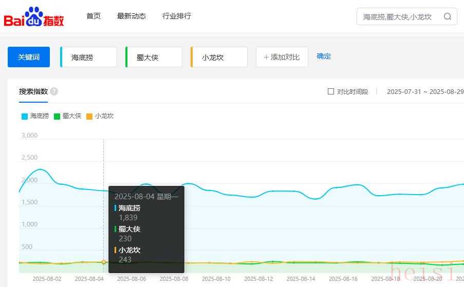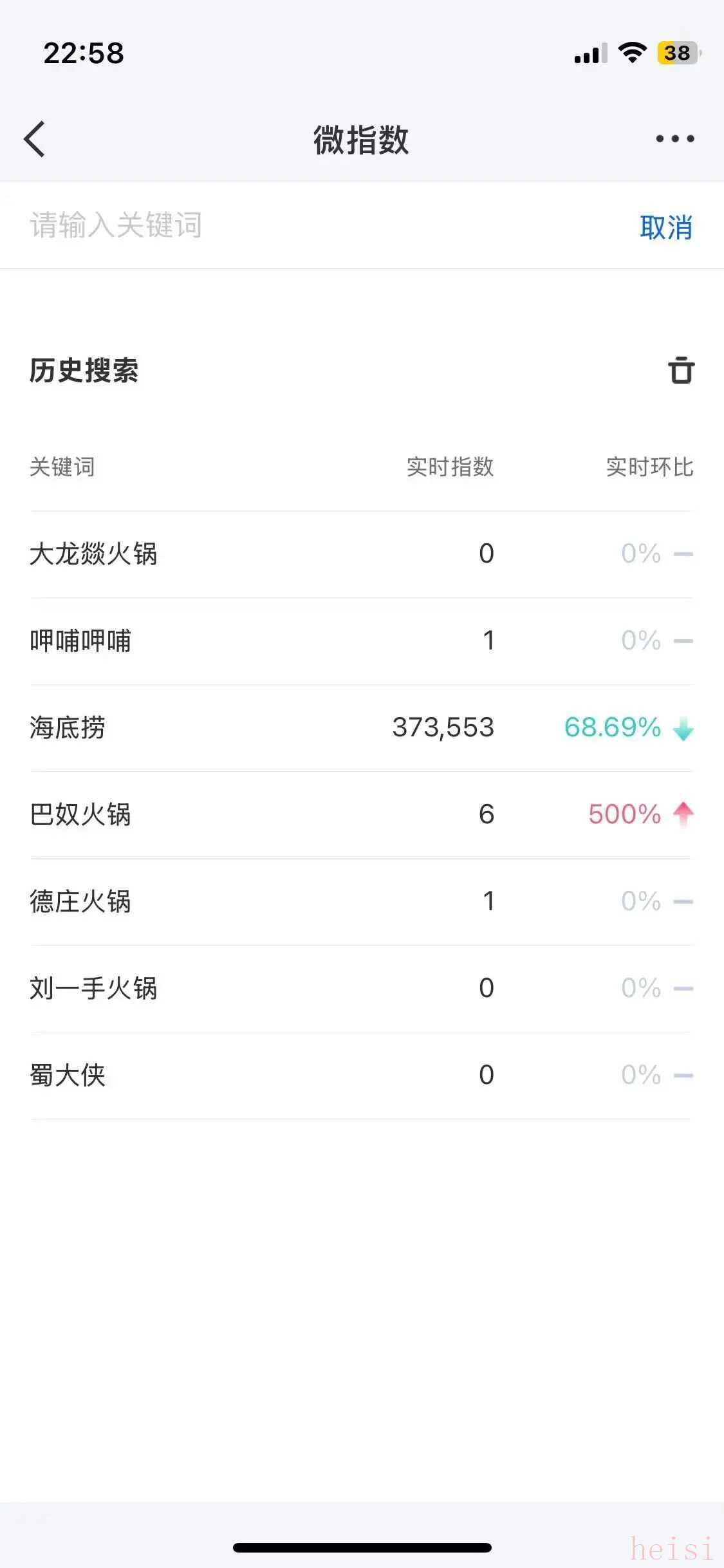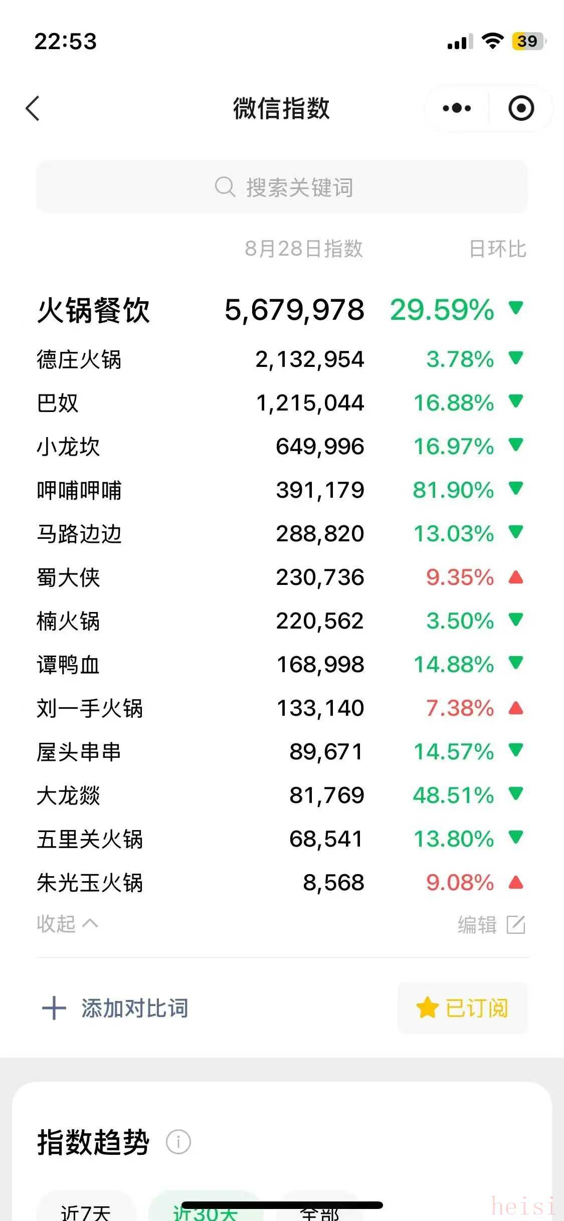 讀者直接在微信內(nèi)搜索微信指數(shù)小程序,打開(kāi)后即可輸入上圖所示的任意關(guān)鍵詞,然后查看其指數(shù)即可。有讀者可能會(huì)問(wèn),你上面的圖里面為什么沒(méi)有海底撈?因?yàn)楹5讚频?月29日的指數(shù)是5445萬(wàn)(差異太大就沒(méi)有放進(jìn)來(lái)),上圖13家火鍋品牌的指數(shù)之和才567萬(wàn)。當(dāng)你以為海底撈已經(jīng)遙遙領(lǐng)先了,殊不知胖東來(lái)的微信指數(shù)高達(dá)16084萬(wàn),海底撈僅有胖東來(lái)的零頭。當(dāng)然,你也可以在百度指數(shù)(在電腦上打開(kāi)index.baidu.com)內(nèi)查看關(guān)鍵詞的指數(shù)(熱度),兩者雖然技術(shù)原理和取數(shù)邏輯有差別,但都能反映出哪個(gè)品牌的指數(shù)(熱度)更高。
