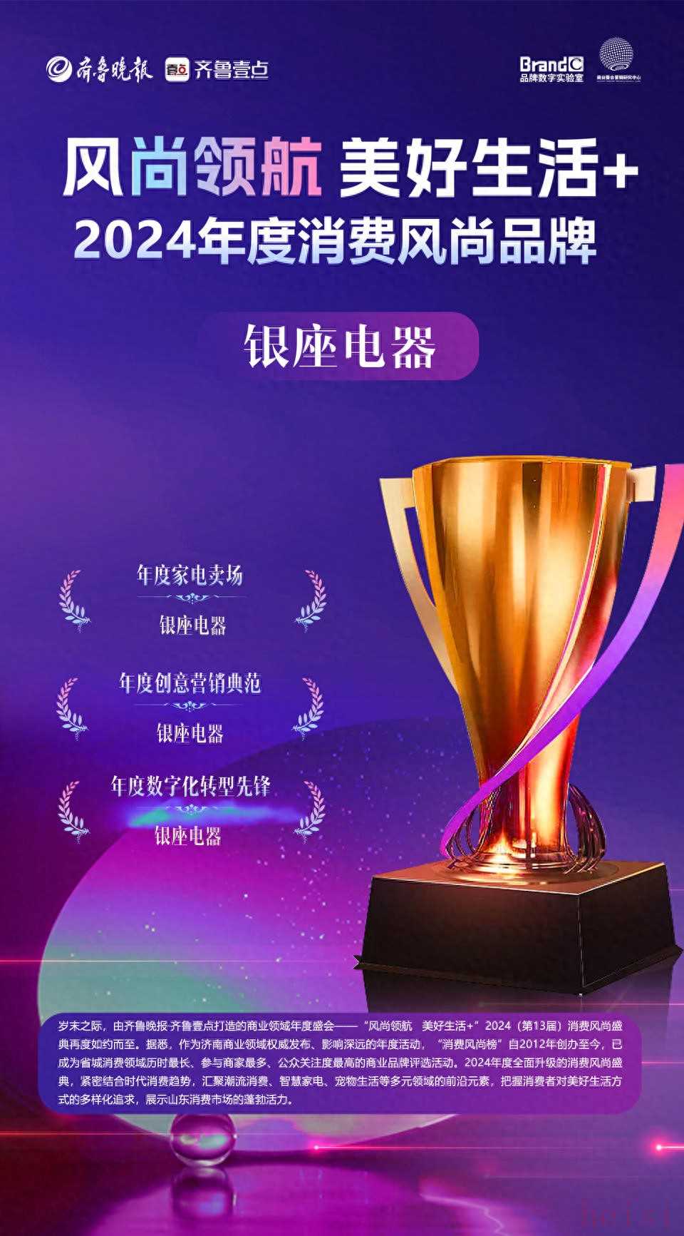 “風(fēng)尚領(lǐng)航 美好生活+”2024(第13屆)消費(fèi)風(fēng)尚盛典隆重揭曉。山東銀座電器憑借卓越表現(xiàn),榮獲“2024年度消費(fèi)風(fēng)尚品牌”,同時(shí),在行業(yè)引領(lǐng)、創(chuàng)意營(yíng)銷及數(shù)字化轉(zhuǎn)型等多個(gè)關(guān)鍵維度實(shí)現(xiàn)持續(xù)突破,同時(shí)攬獲了“年度家電賣場(chǎng)”“年度創(chuàng)意營(yíng)銷典范”和“年度數(shù)字化轉(zhuǎn)型先鋒”三項(xiàng)大獎(jiǎng)。