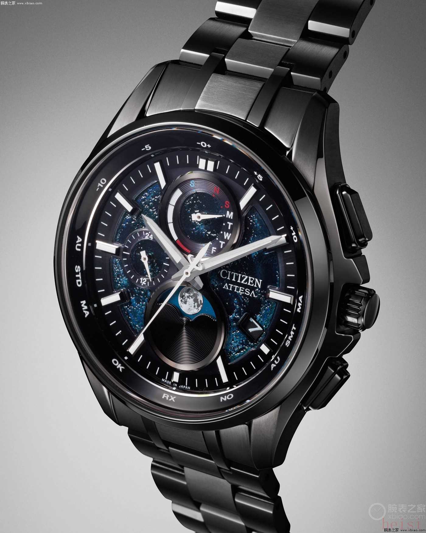 該腕表在Attesa系列中首次引入珍珠母貝表盤,珍珠母貝在彩色底座上層層疊疊,營造出以月球表面為靈感的外觀效果。這款腕表搭載F950機(jī)芯,可在短短3秒內(nèi)接收時間信號,具有1/20秒計時、萬年歷、世界時和動儲指示功能。充滿電后,省電模式下,續(xù)航時間長達(dá)5年。與前作一樣,該腕表的中心鏈節(jié)同樣以再結(jié)晶鈦金屬打造。