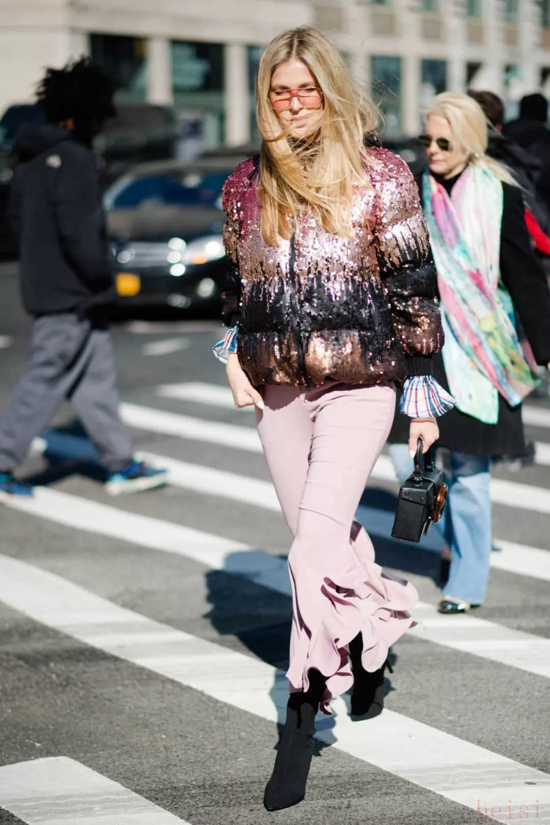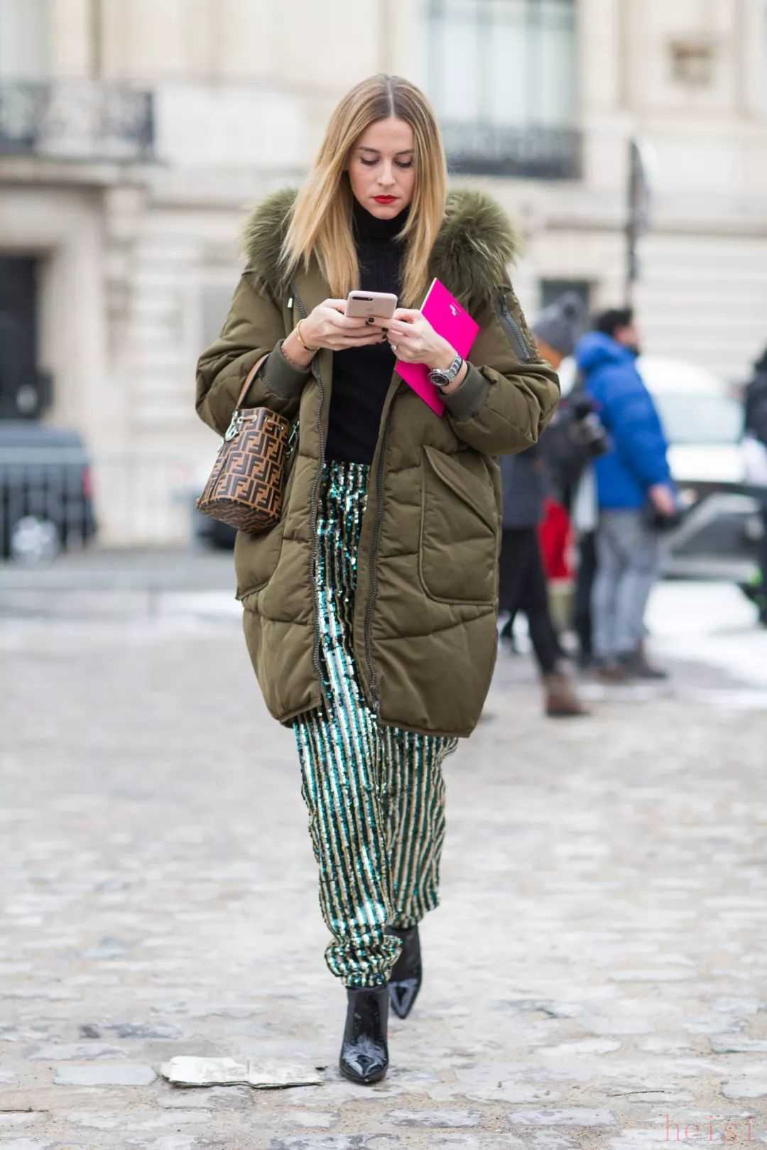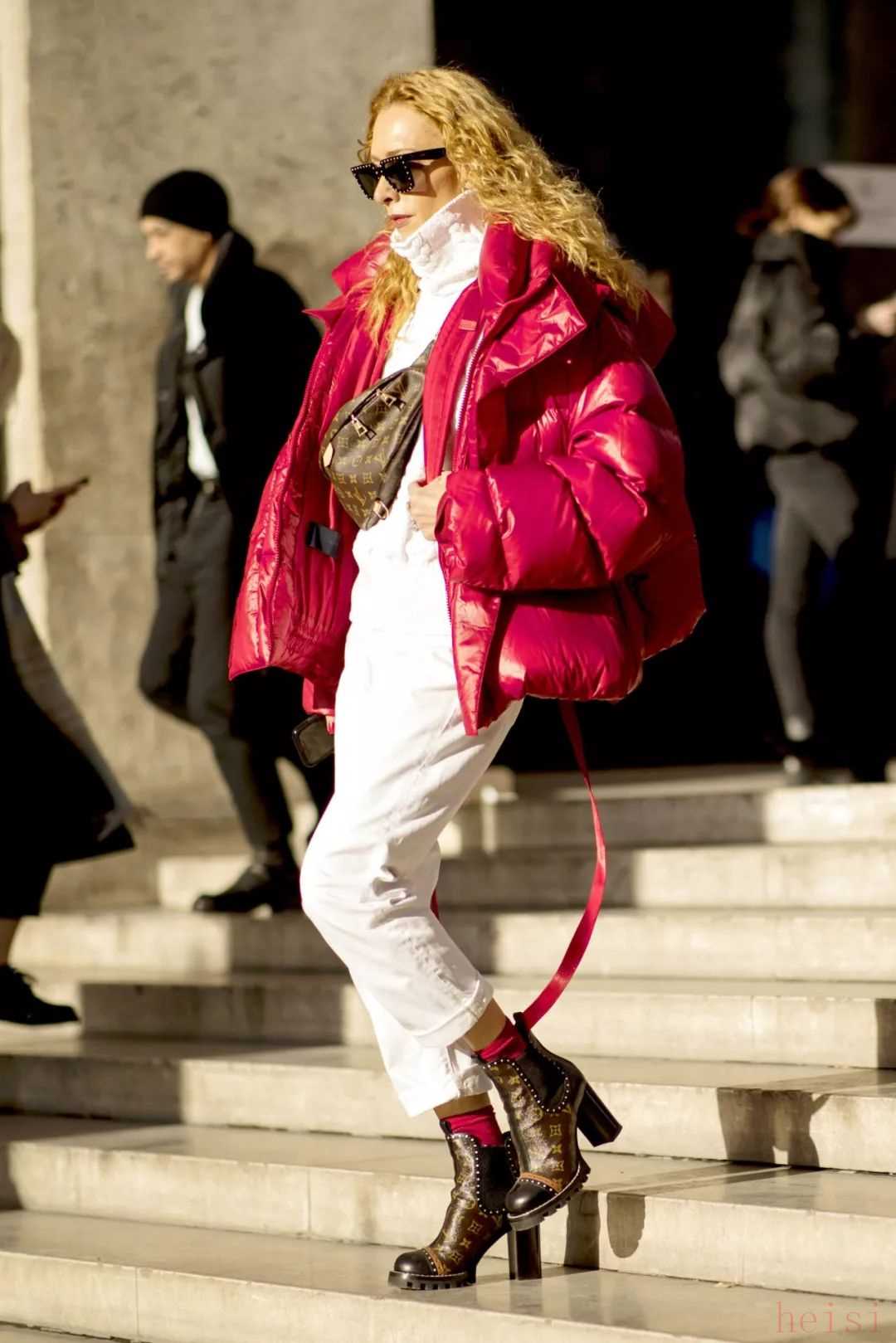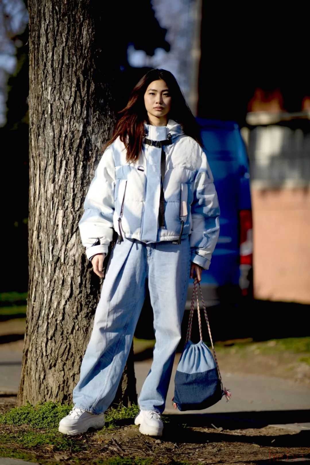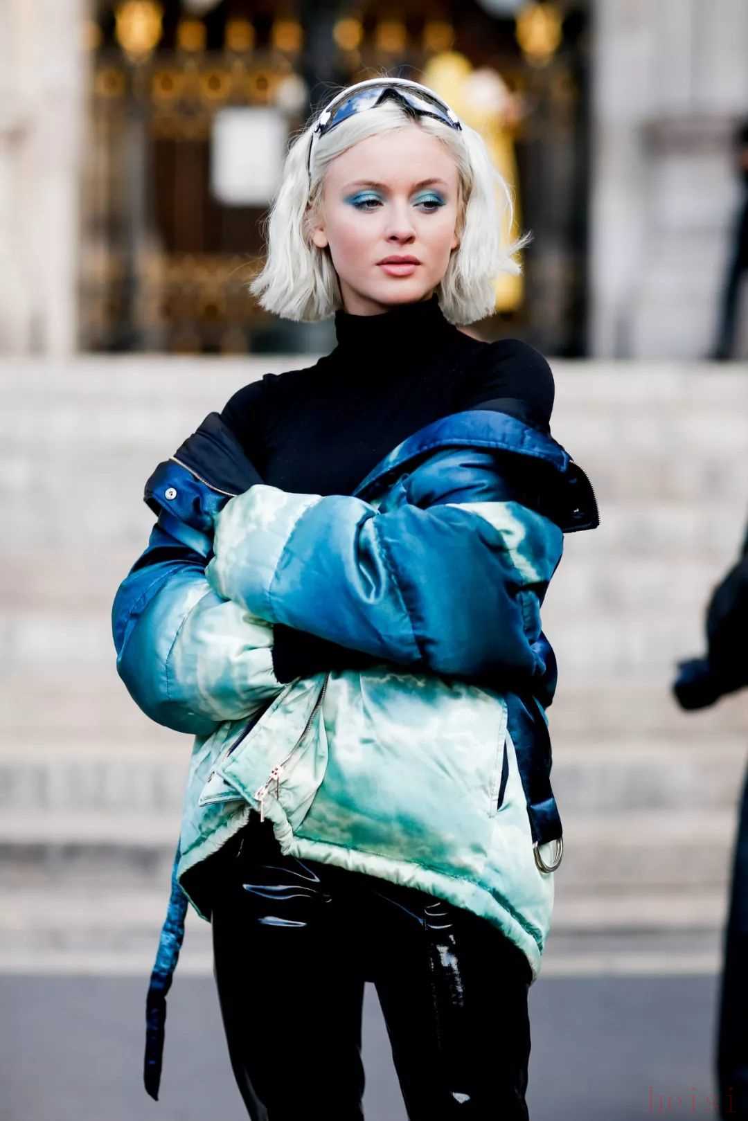 如果說(shuō)扎染圖案的羽絨服實(shí)穿性不是很高的話,那就不妨像吳宣儀和歐陽(yáng)娜娜一樣,選擇一件自帶發(fā)光效果的反光面料羽絨服。類(lèi)似這樣未來(lái)感十足的亮面材質(zhì)近年來(lái)被越來(lái)越多用在了羽絨服上,看似夸張的款式在搭配上反而并不困難——本身已經(jīng)足夠亮眼的亮面羽絨服其實(shí)只需要利用簡(jiǎn)單的純色單品來(lái)進(jìn)行搭配即可,以免造成重點(diǎn)過(guò)多而顯得累贅和繁復(fù)。