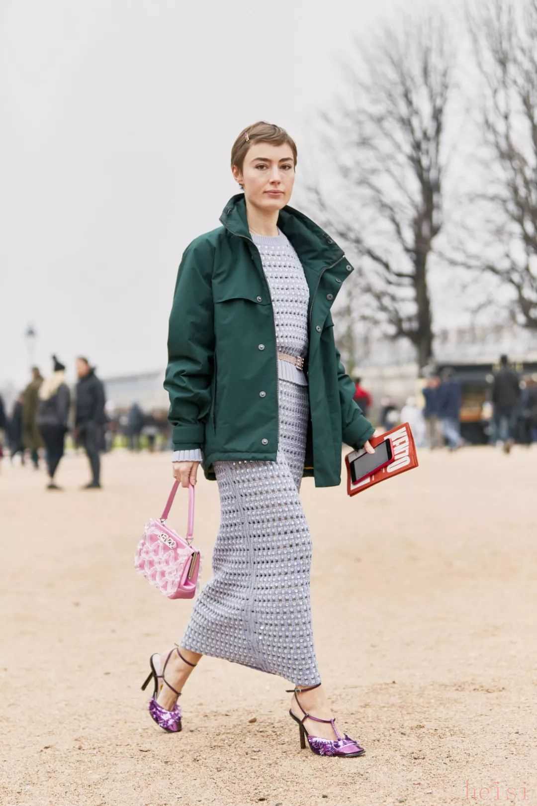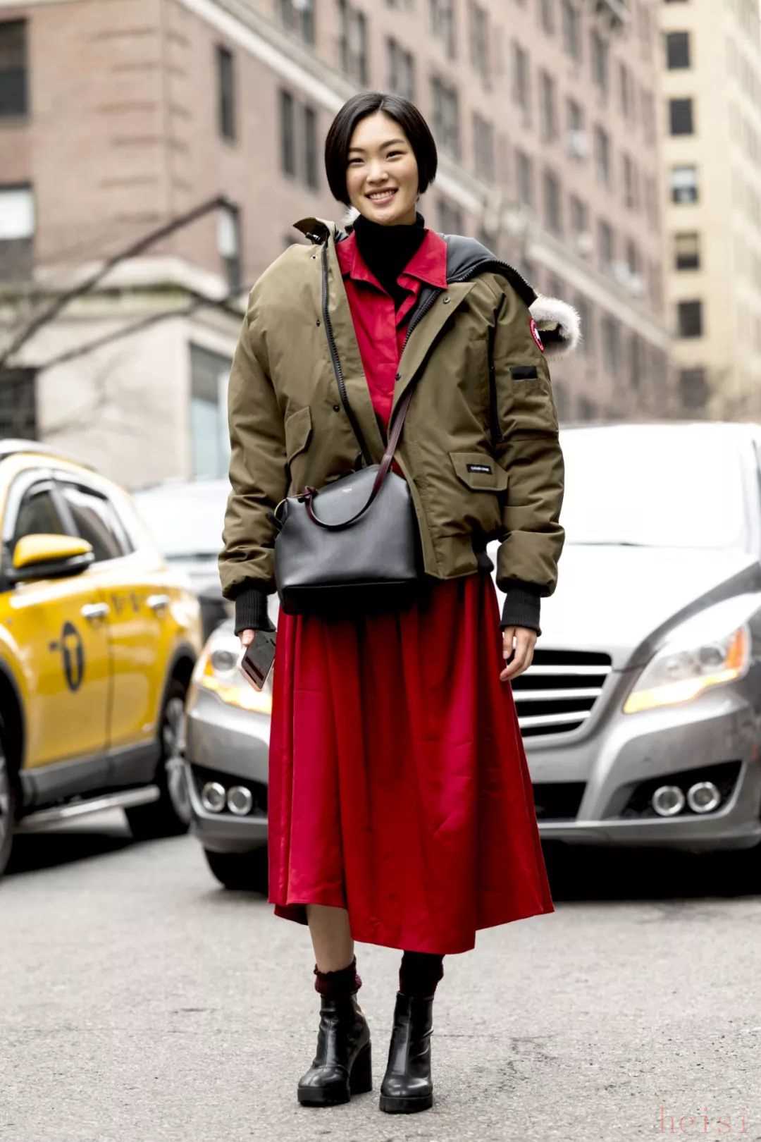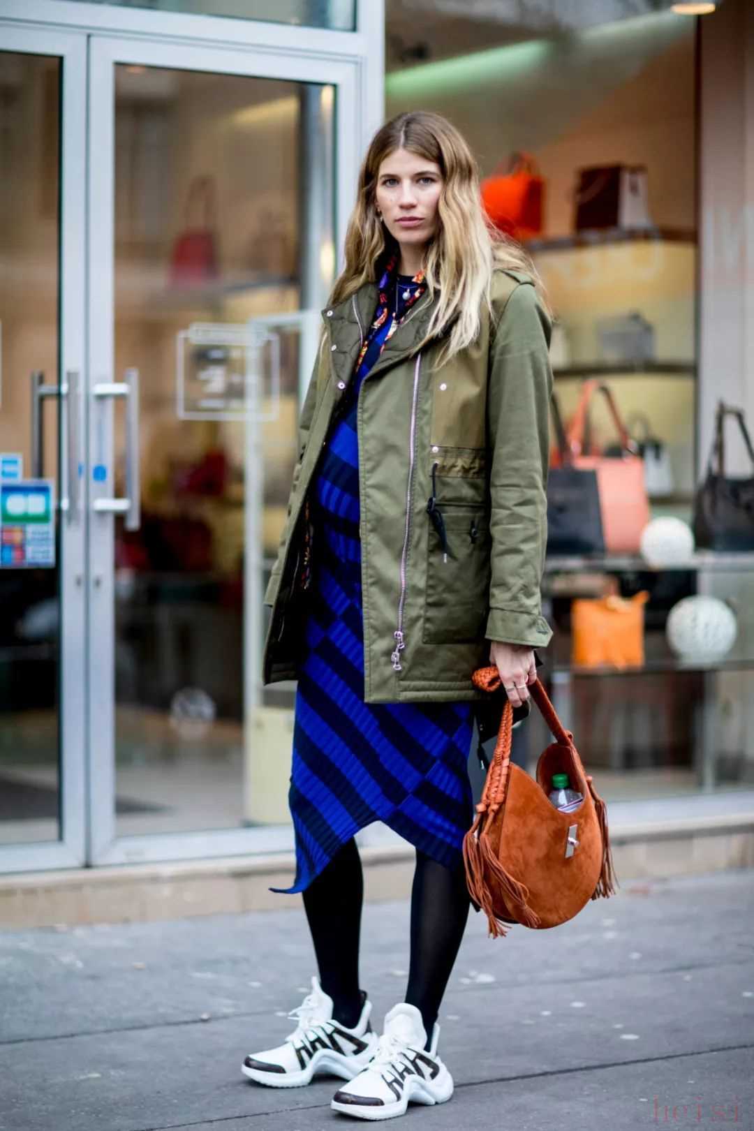 除了可以和帥氣的馬丁靴組cp,派克大衣和女人味十足的長(zhǎng)裙玩起娘man平衡的混搭look也是不在話下。為了避免長(zhǎng)裙和大衣疊加而產(chǎn)生過(guò)于臃腫和累贅的視覺(jué)效果,選擇一件相對(duì)短款的派克大衣或是色彩對(duì)比度較大的內(nèi)搭就是一個(gè)明智的選擇。