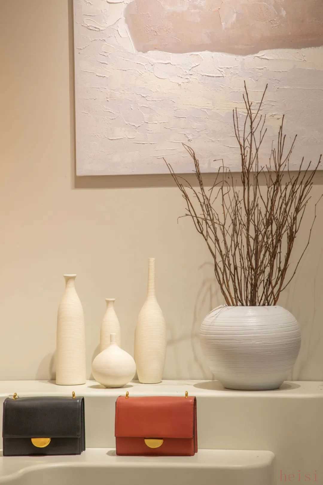 不同形態(tài)的枯枝、干花、砂石等天然材料融合進(jìn)空間里,讓空間自然隨意、簡(jiǎn)約不失時(shí)尚。樸素的花枝插在造型簡(jiǎn)潔的陶瓷瓶里,清新素雅;粗礪觸感的水粉畫,呈現(xiàn)出簡(jiǎn)單的純粹和質(zhì)樸。無(wú)聲的設(shè)計(jì)感充斥于空間內(nèi),創(chuàng)造出豐富的視覺層次。