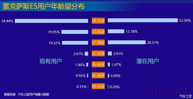 而根據(jù)汽車之家用戶畫像大數(shù)據(jù),2020年起雷克薩斯用戶年輕化趨勢明顯。以ES為例,根據(jù)其數(shù)據(jù),18-22歲用戶占據(jù)54.44%,23-26歲用戶占比19.95%,27-30歲用戶占比19.52%。也就是說18-30歲用戶占ES整體用戶比例超過94%。剩下31-55歲的ES用戶總和不到6%。
