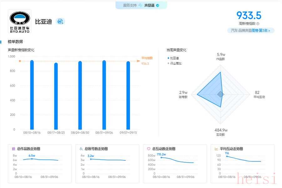新榜品牌聲量?汽車周榜(09 月 07 - 09 月 13 日)發(fā)布,比亞迪以 933.5 的聲量新榜指數(shù)位居第三 ,穩(wěn)坐汽車榜前列。