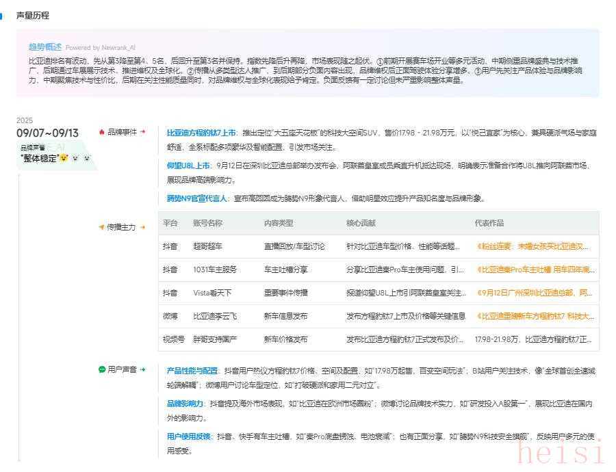 - 用戶使用反饋:抖音、快手有車主吐槽,如“秦Pro底盤銹蝕、電池衰減”;也有正面分享,如“騰勢N9科技安全旗艦”,反映用戶多元的使用感受。