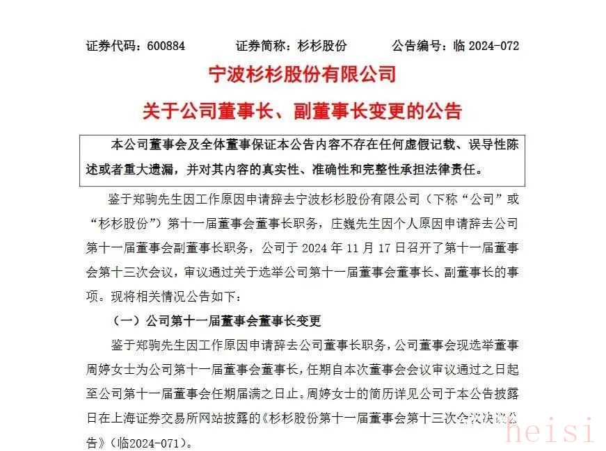 昨天(11月18日)晚上,杉杉股份公告鄭駒辭去公司董事長職務(wù),公司董事會選舉周婷為新任董事長。