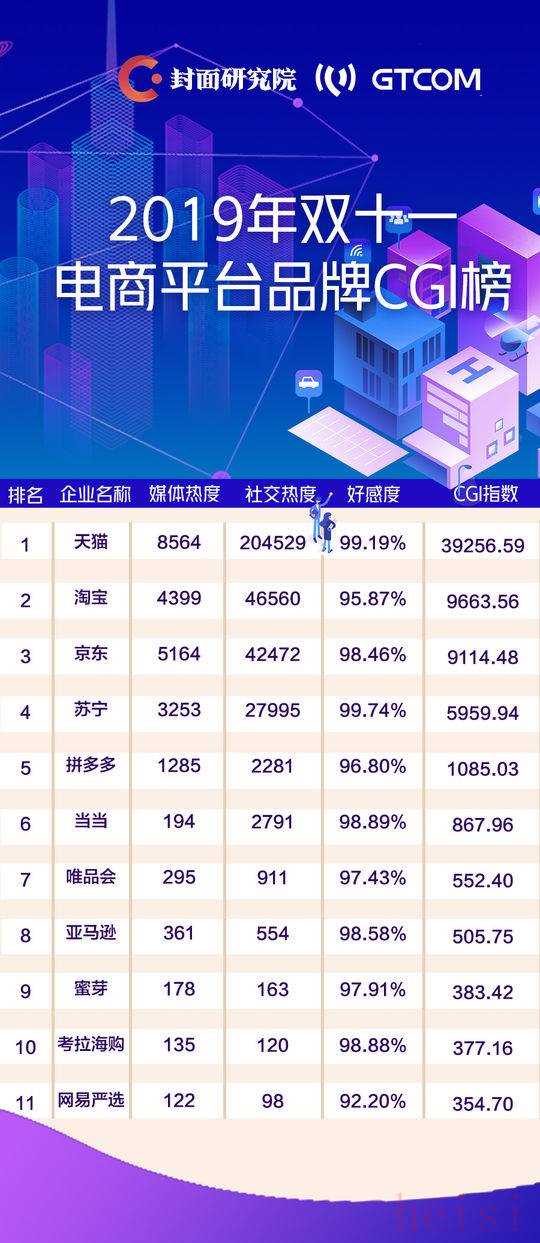 此次發(fā)布的《2019雙十一電商平臺品牌CGI榜》對各大電商平臺在雙十一期間的媒體熱度、社交熱度、品牌好感度進(jìn)行了梳理,并計算得出了最終的CGI指數(shù)排名。
