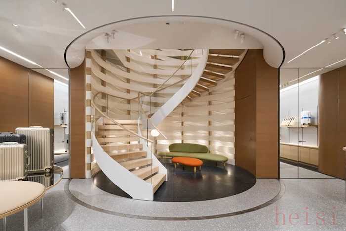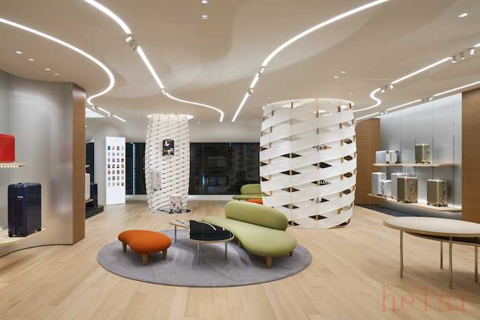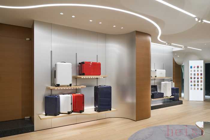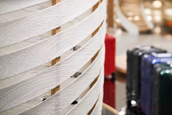 旋轉(zhuǎn)式的樓梯和展示籃是這個(gè)空間里的亮點(diǎn)之一。作為對(duì)日本手工藝的一種現(xiàn)代詮釋,用竹子和半透明紙制作的滑動(dòng)門和房間隔板,使展示區(qū)不再單調(diào);旋轉(zhuǎn)式樓梯直通三層,作為流動(dòng)線條的延續(xù)。據(jù)悉,二層不僅有展示區(qū),還有客戶服務(wù)中心。RIMOVA Original、Classic、Essential和Hybrid系列,以及Off-White?& RIMOVA聯(lián)名款都有呈現(xiàn),還能讓人們對(duì)行李箱制造工藝有全面的了解,以及提供部分修理的服務(wù)項(xiàng)目。