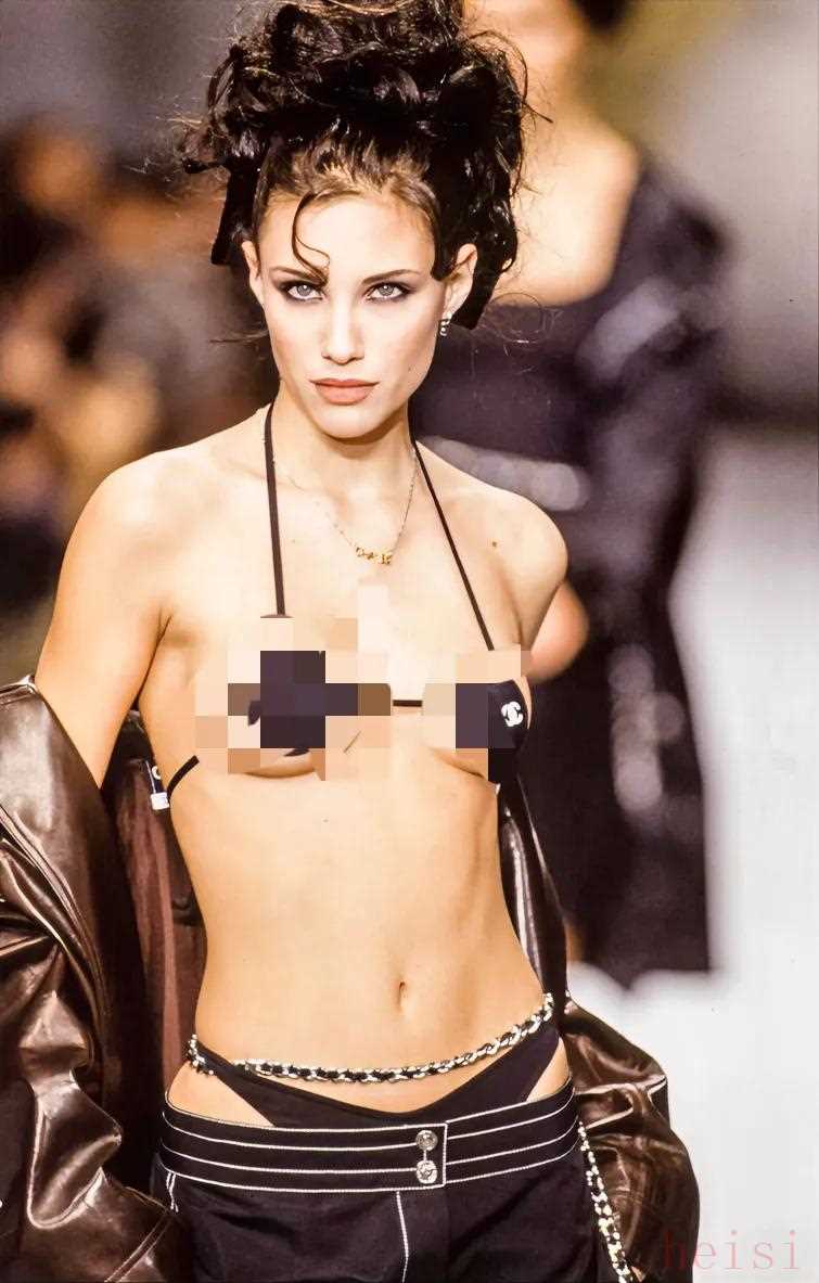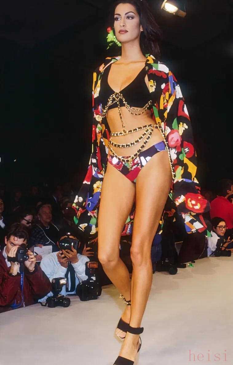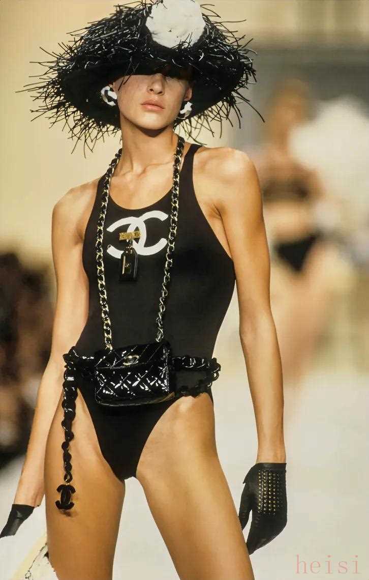 香奈兒 (Chanel) 20 世紀(jì) 90 年代的泳裝風(fēng)格與其著名的經(jīng)典粗花呢泳衣有所不同,采用了幾乎透明的比基尼上衣和鏈條套裝。