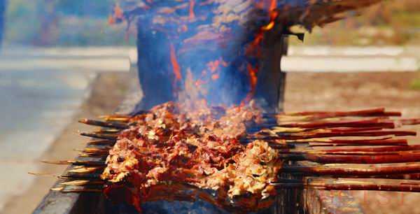 串在紅柳枝上的烤羊肉,撒上了孜然等香料,便帶出了一種叫人欲罷不能的香氣。