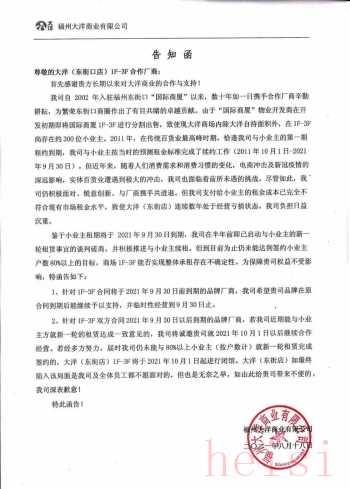 “8月18日,我們大洋百貨東街店部分商戶,接到福州大洋商業(yè)有限公司告知函?!贝笱蟀儇洊|街店的一名商戶告訴記者,告知函表示,商場1~3層能否實現(xiàn)整體承租存在不確定性,2021年10月1日起大洋(東街店)1~3層或?qū)㈤]館。