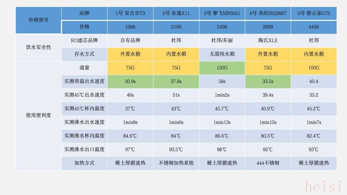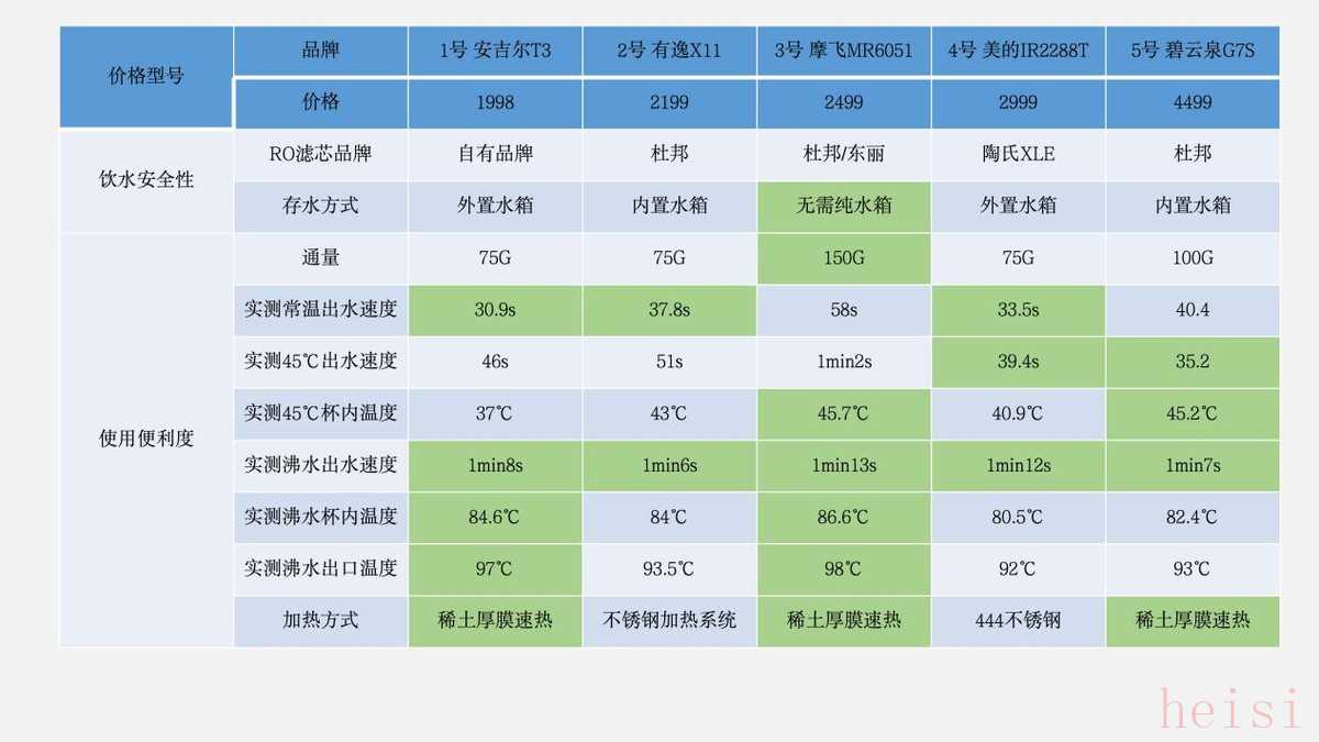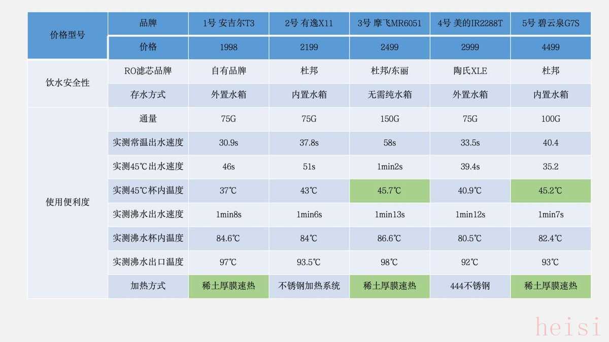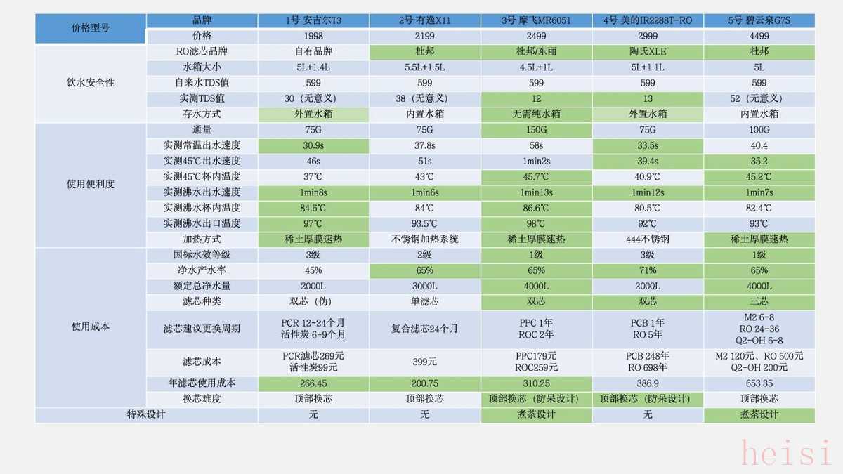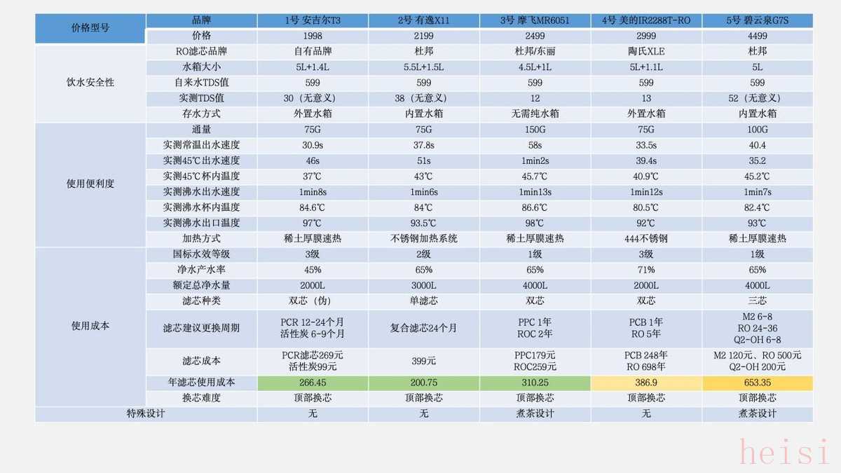關(guān)于使用成本我?guī)痛蠹野堰@幾款都算出來(lái)了,其中1號(hào)安吉爾、2號(hào)友逸以及3號(hào)摩飛都在200-300價(jià)位段,4號(hào)美的會(huì)略高一點(diǎn),而5號(hào)碧云泉的使用成本接近翻倍。