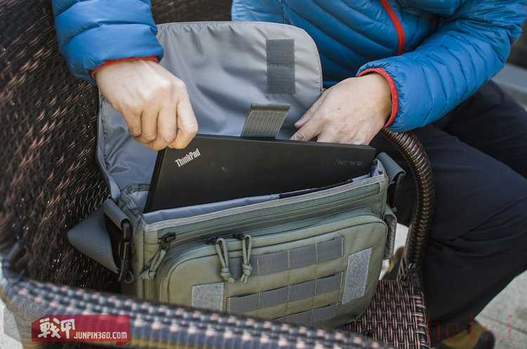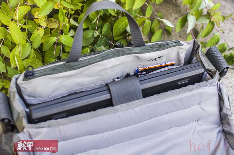 電腦倉前后都有填充物,起到緩沖保護(hù)作用。TT單肩包S可以放下13寸筆記本電腦。另外,電腦倉還有一條寬大的尼龍固定帶,通過魔術(shù)貼粘貼,可以防止倒置電腦滑落。