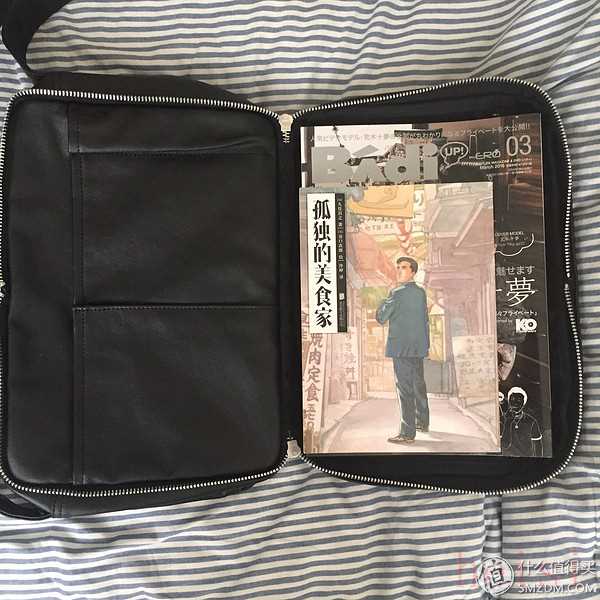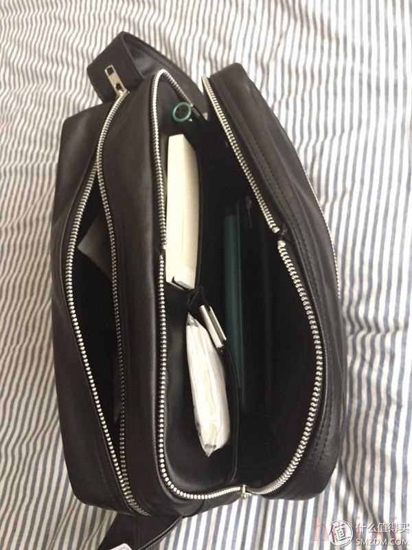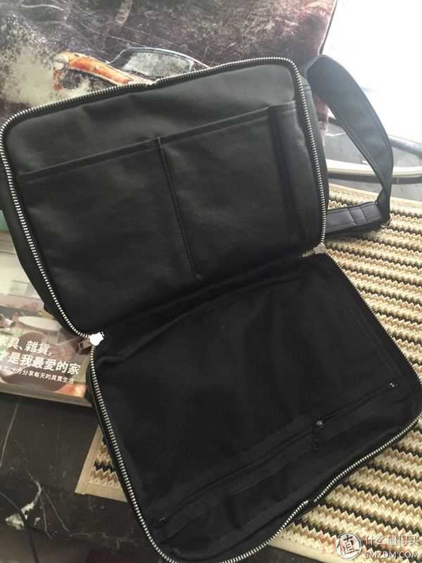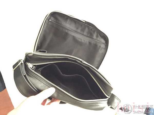 然后打開第一層,可以完全平攤開,一邊是兩個獨立的小包袋加一個放筆的,適合放個小本子。然后另外一邊呢是個拉鏈的隔層。中間當然也可以隨身帶本書什么的,但是太大的雜志是放不下的。(其實一般大16開雜志都放不下,只能放小于這個尺寸的),可以參考下圖。