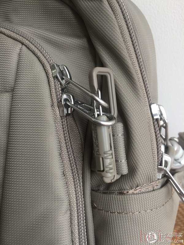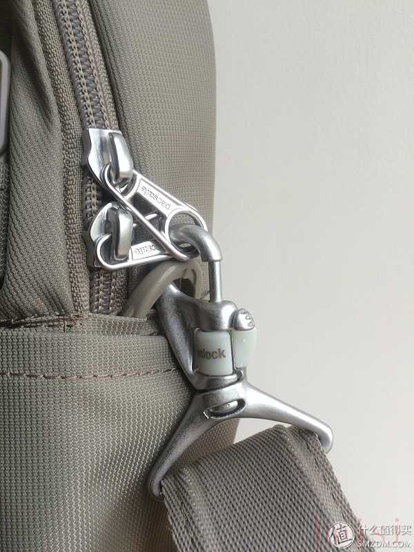 這個(gè)鎖很多熟悉Pacsafe的朋友就不用多介紹了,可以鎖住主包拉鏈,也可以將肩帶歇下栓在椅子或者桌子腿上,特別適合在公共場(chǎng)合吃飯或者小坐的時(shí)候,讓順手牽羊的賊根本沒(méi)有可乘之機(jī)。這里說(shuō)一下,舊款的拉頭太容易掉漆了,現(xiàn)在直接換成金屬本色,完全解決了這個(gè)BUG.