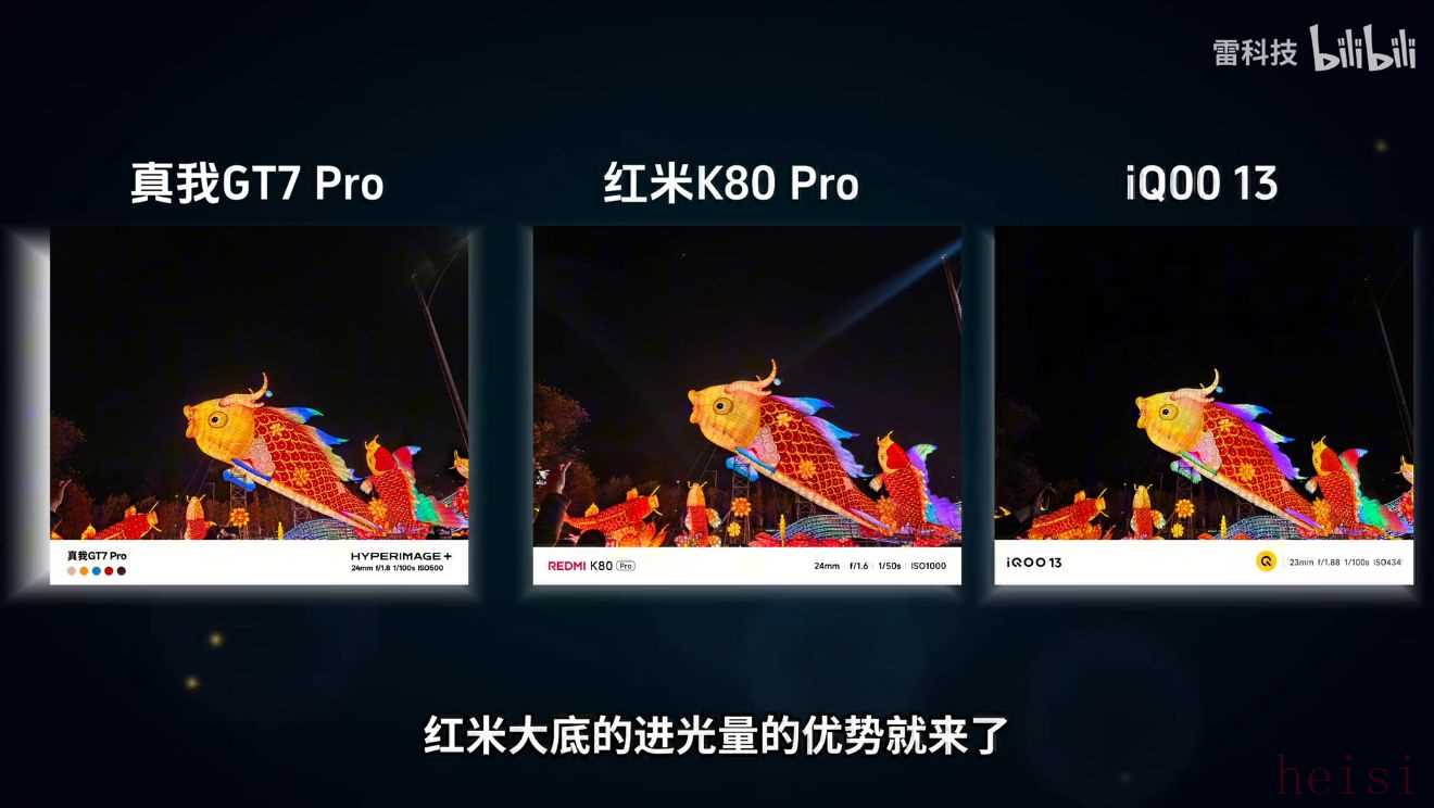 (圖片來自雷科技)夜景部分,由于REDMi K80 Pro主攝傳感器面積更大,占據(jù)更多的進(jìn)光量優(yōu)勢,畫面整體更純凈,涂抹感更少,暗處的細(xì)節(jié)保留的更多。至于GT7 Pro和iQOO 13,也更多是高光壓制策略和色彩風(fēng)格上的標(biāo)定有區(qū)別。