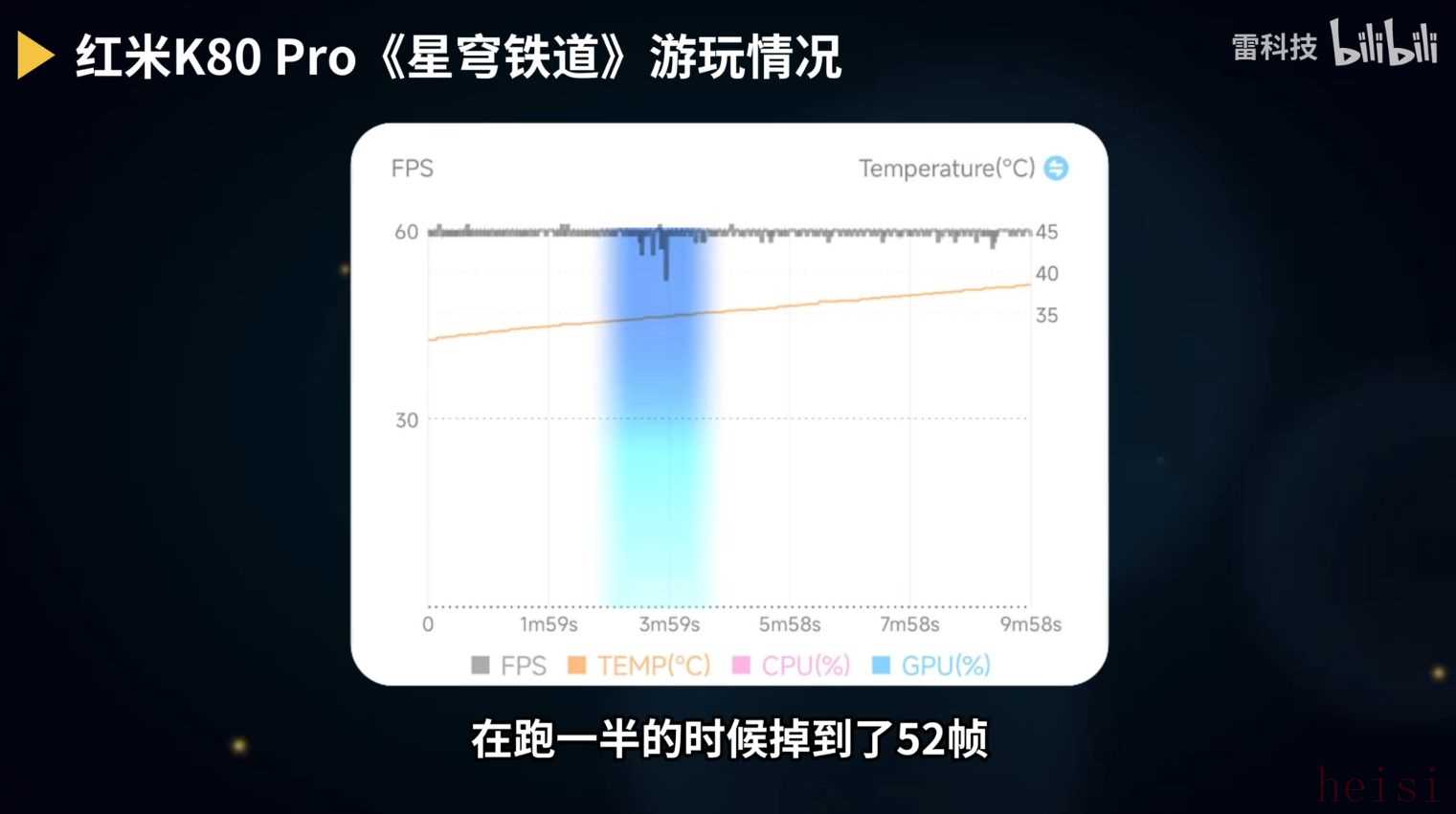 再來看看負(fù)載最高的《星穹鐵道》,黃金時代跑圖,REDMI K80 Pro在跑到一半時突然掉到52幀,短暫波動后又恢復(fù)到60幀,最后下來平均幀率為59.7幀。這一次REDMI K80 Pro的兩顆超大核終于舍得動起來了,只是保存了一定的實(shí)力,占用率在60%-80%之間,整體的功耗5.1W,提升最高溫度40.1℃。