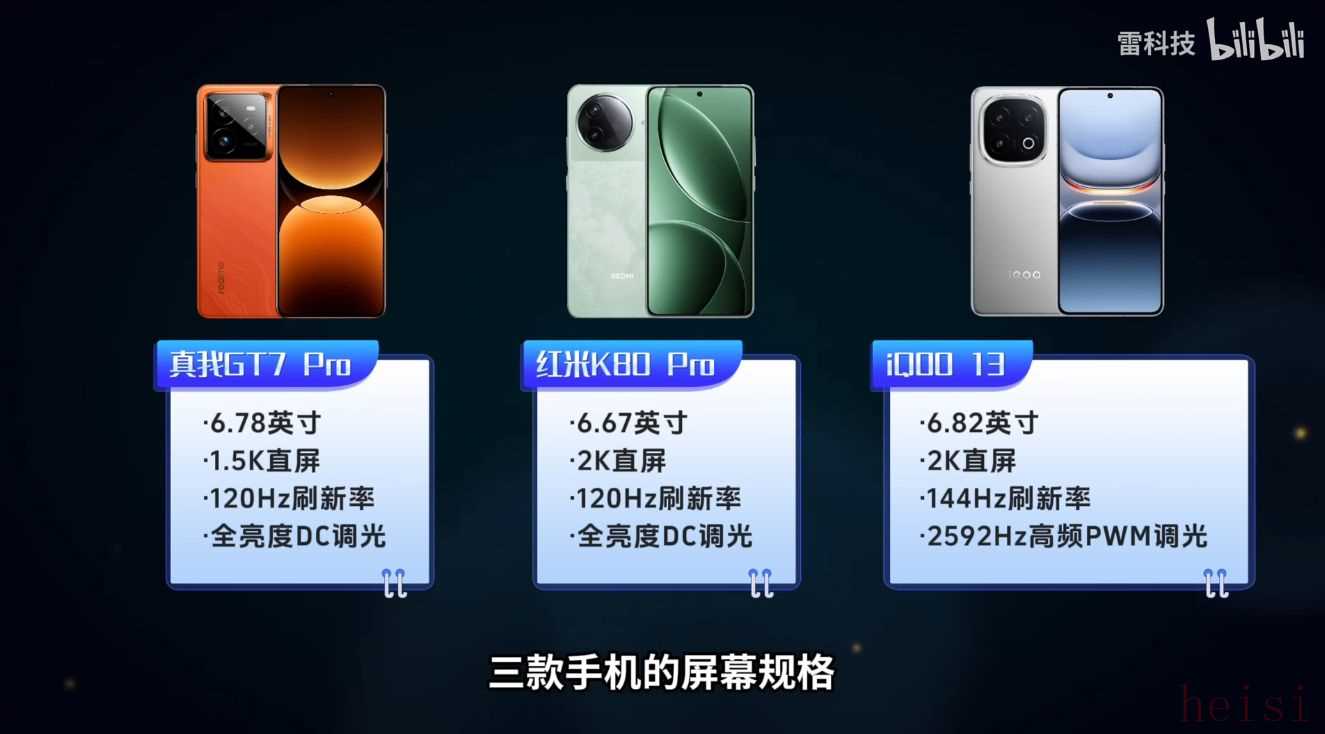 先來快速過一遍三款手機(jī)的屏幕規(guī)格,其中iQOO 13和REDMI K80 Pro都配備了2K級別分辨率的屏幕,真我GT7 Pro則是1.5K,并且先進(jìn)的調(diào)光策略、120Hz刷新率均沒有一項(xiàng)缺席。