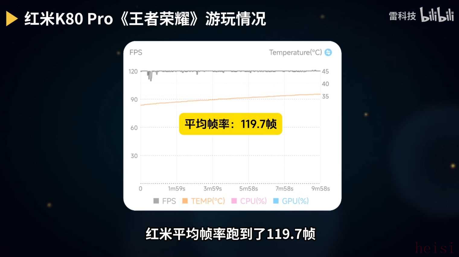 王者極致畫質(zhì)加120幀,所有特效全開,REDMI K80 Pro平均幀率達(dá)到了119.7幀。開頭加載壓力大,出現(xiàn)了一些波動,CPU占用高達(dá)60%-70%,好在整體的功耗控制出色,平均只有3.34W,最高溫度也才37℃,在手上還沒有明顯的熱感。
