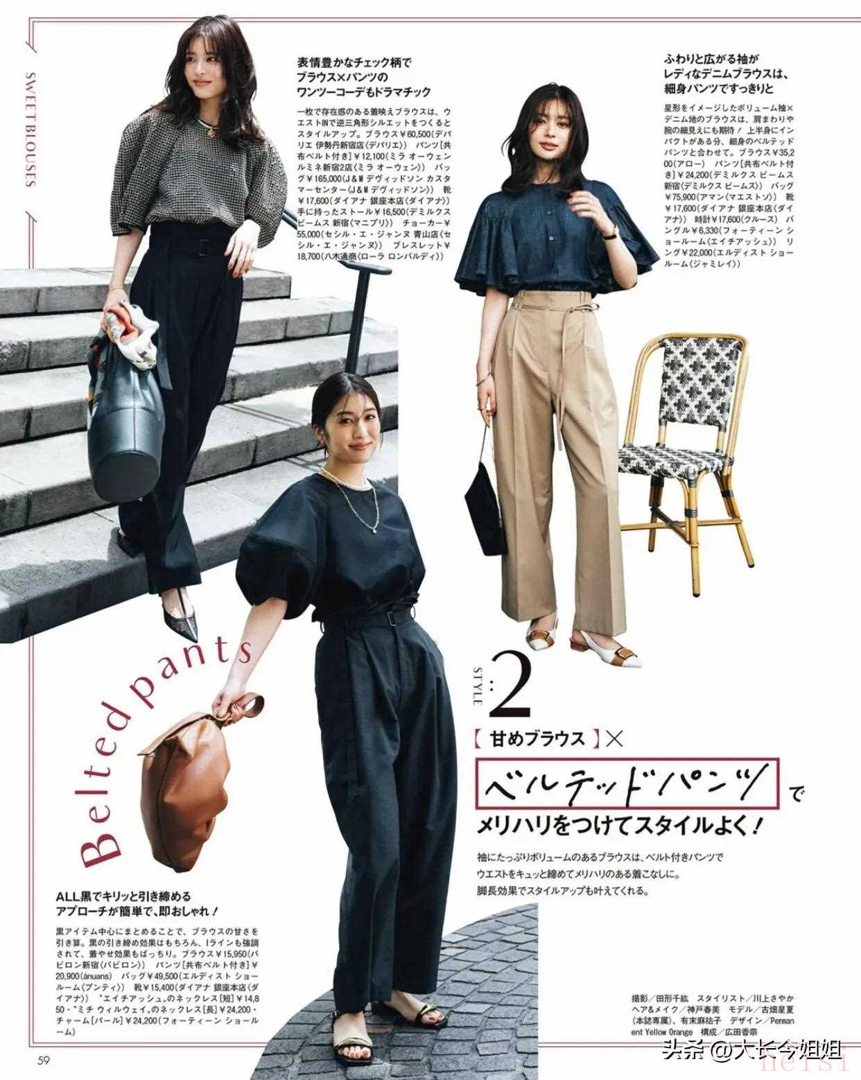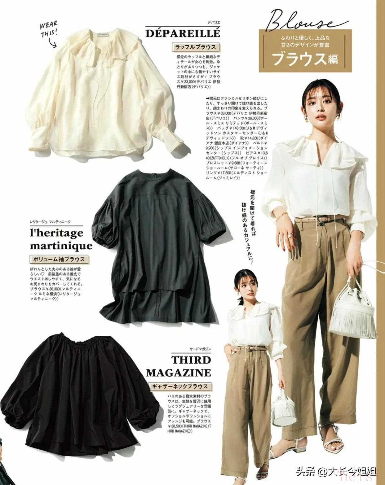 領(lǐng)口系上古典的蝴蝶結(jié)的襯衣,可以做個(gè)清爽的發(fā)髻,改變臉周圍的印象;圓形的打褶袖口很可愛(ài),前后長(zhǎng)度差可以遮住臀部周圍,穿出脫俗的休閑風(fēng)格;有張力的黑色圓弧領(lǐng)襯衣,使用甜美元素的燈籠袖和前襟的豎條褶裥的寬版裁剪。