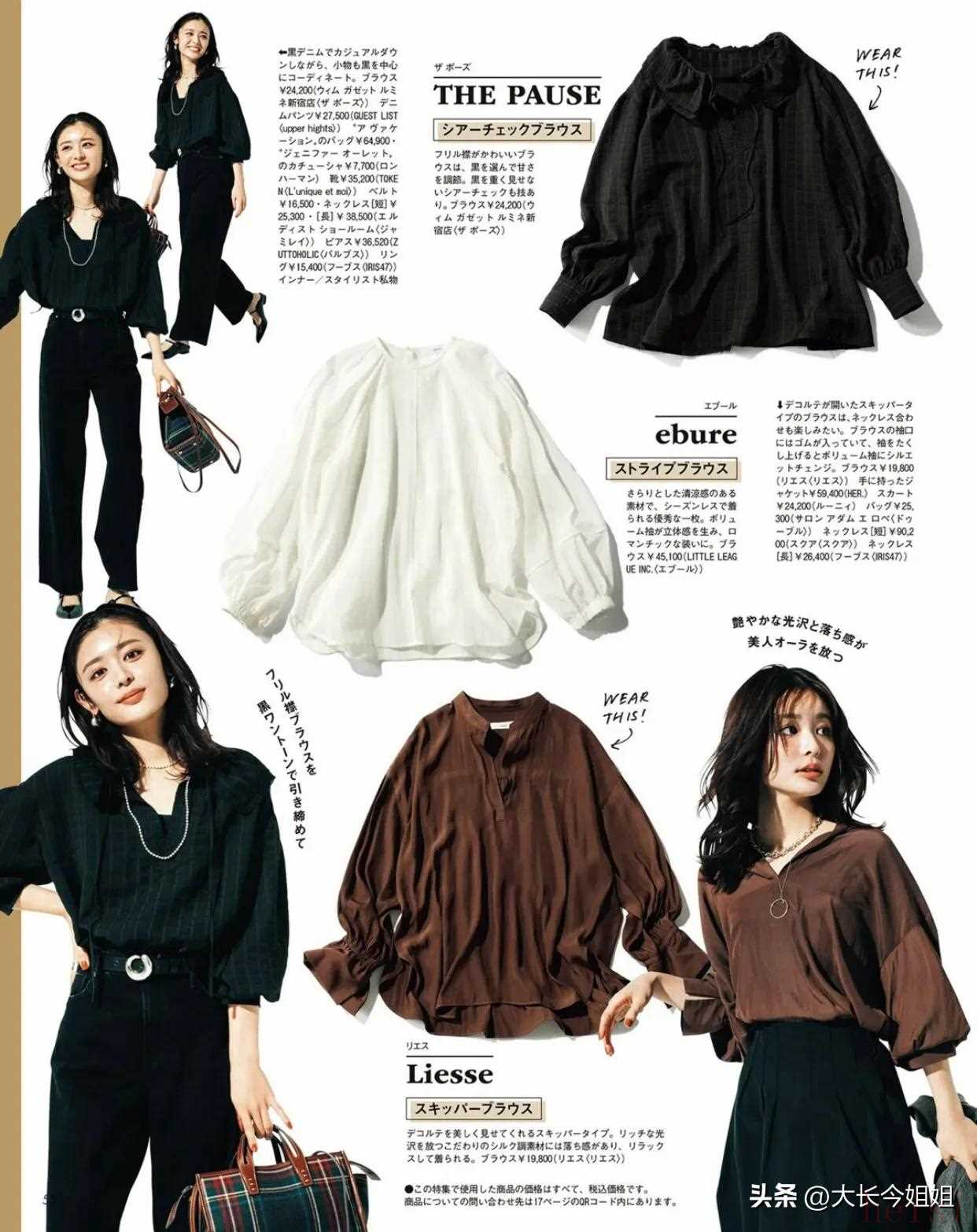 荷葉邊翻領(lǐng)襯衫使用黑色單一調(diào)來(lái)彰顯;使露肩顯得美麗的巧克力色襯衫,釋放豐富的光澤絲綢質(zhì)地顯得低調(diào),能放松地穿著。