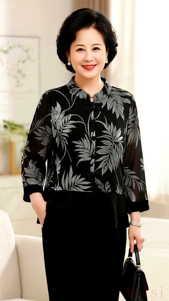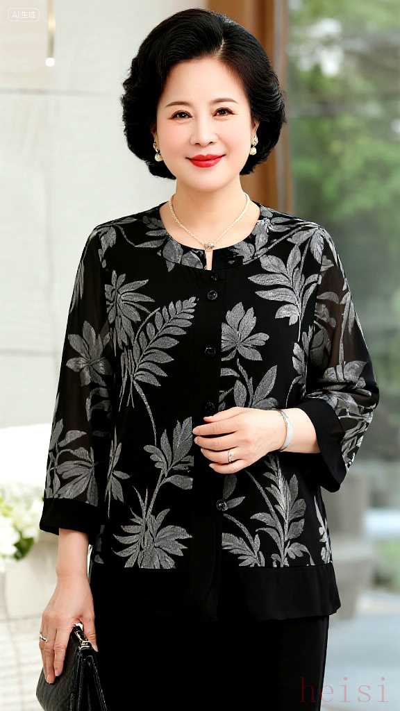 這款“黑底銀灰色植物圖案雪紡面料寬松襯衫”為中老年女士的秋季穿搭提供了很多可能性。它結(jié)合了幾個特點(diǎn):"基礎(chǔ)色(黑)"、"柔和的金屬色(銀灰)"、"自然的元素(植物圖案)"、"輕盈的面料(雪紡)" 和 "舒適的版型(寬松)"。