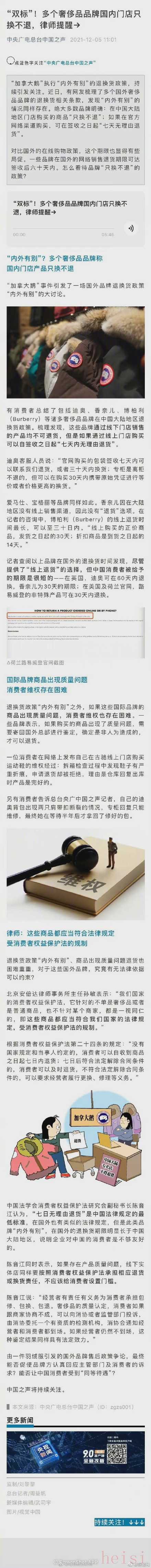 您提到的“雙標(biāo)”現(xiàn)象,即奢侈品牌在中國(guó)市場(chǎng)實(shí)行與國(guó)際市場(chǎng)不同的銷售政策,特別是“離柜不退”的售后政策,確實(shí)是近年來(lái)備受關(guān)注和討論的話題。