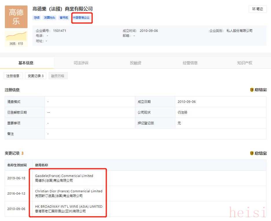 值得注意的是,啟信寶顯示,高德樂(法國)商業(yè)有限公司曾用名為“Christian Dior (France) Commericial Limited 克麗斯汀迪奧(法國)商業(yè)有限公司”。 無論是曾用名還是現(xiàn)用名,高德樂均在名字里面加上了法國字樣,但該公司的注冊地在中國香港,并非法國。
