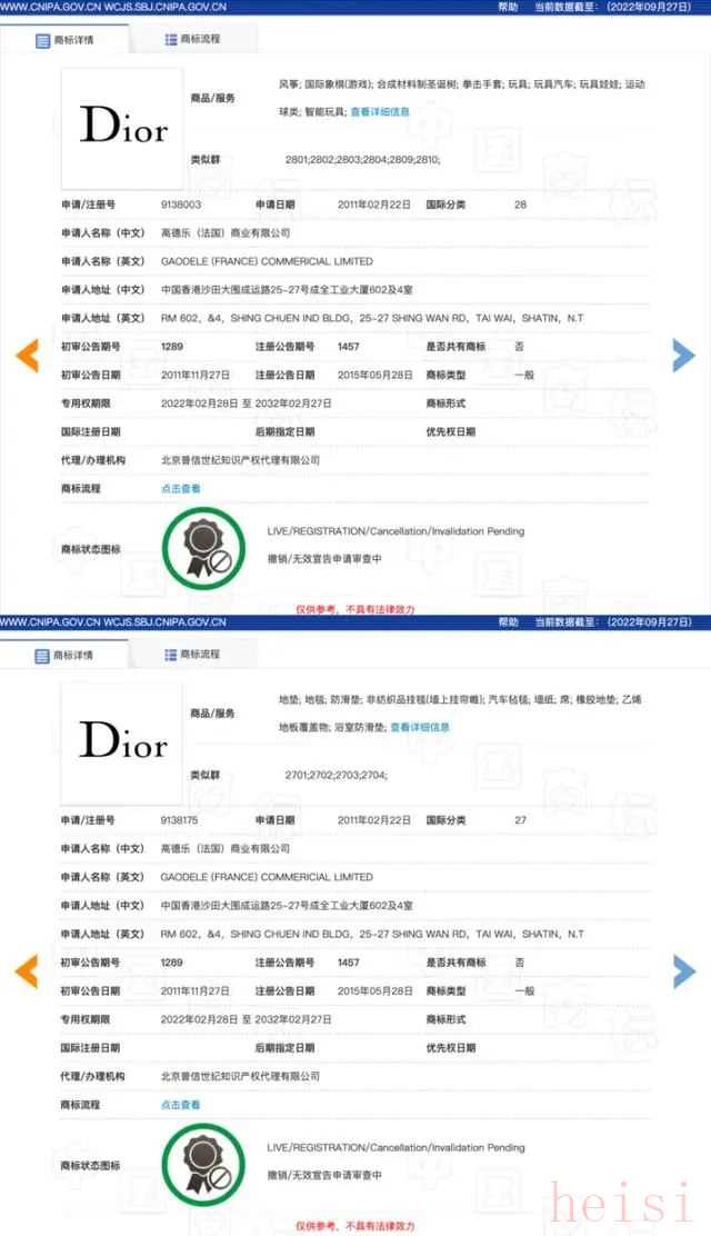 據(jù)中國商標網(wǎng),申請人高德樂(法國)商業(yè)有限公司注冊的“Dior”商標涉及國際分類中的27、28類,即玩具和運動裝備領(lǐng)域,申請日期為2011年2月22日,專用權(quán)期限為2022年2月28日至2032年2月27日。 目前,該商標狀態(tài)為撤銷/無效宣告申請審查中。