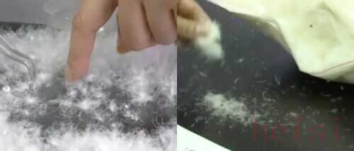檢驗(yàn)人員表示,國(guó)家標(biāo)準(zhǔn)規(guī)定羽絨服主要填充物是一朵一朵的帶有絨核結(jié)構(gòu)的朵絨,這種朵絨堆在一起可以聚集較多的空氣,從而保證良好的保暖性能。而抽檢中的羽絨服,填充物主要是一根一根由羽毛粉碎后形成的羽絲,保暖性很差。